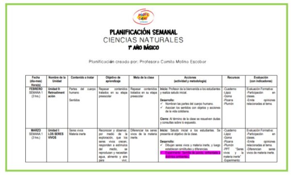 Planificación anual de la asignatura de Ciencias Naturales para 1° Año Básico, organizada semanalmente. Incorpora todos los OA de las Bases curriculares.