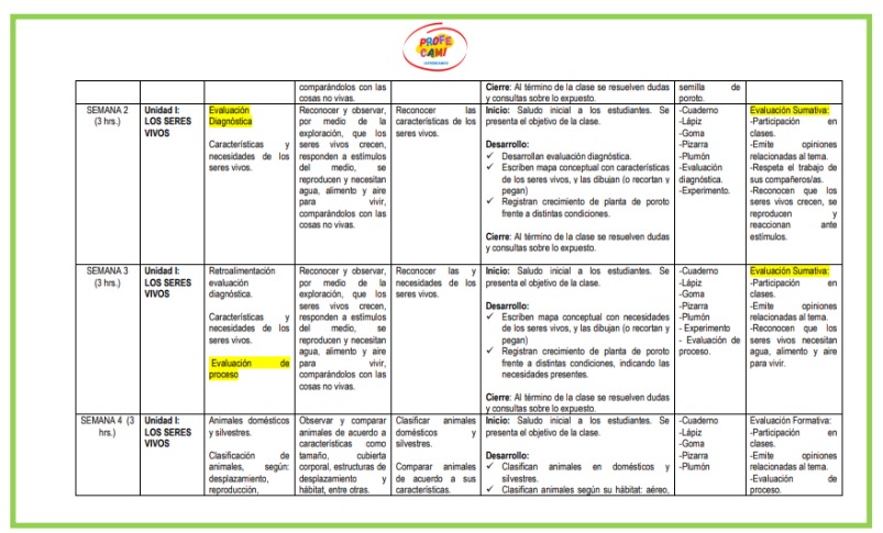 Planificación anual de la asignatura de Ciencias Naturales para 1° Año Básico, organizada semanalmente. Incorpora todos los OA de las Bases curriculares.