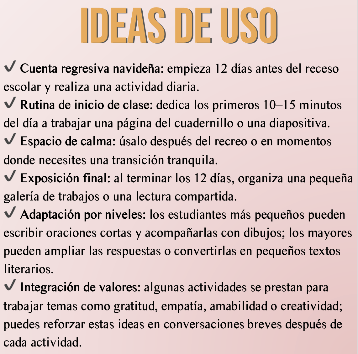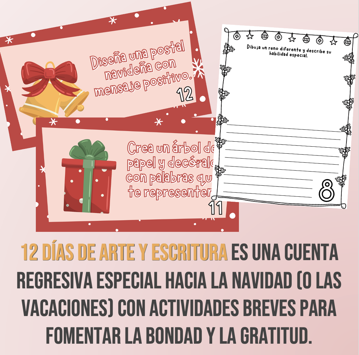 12 días de arte y escritura es una actividad ideal para acompañar el cierre del trimestre o la cuenta regresiva hacia las vacaciones de diciembre. Cada día propone una invitación diferente a imaginar, agradecer, crear o reflexionar, en actividades breves que promueven la expresión personal y el bienestar emocional.