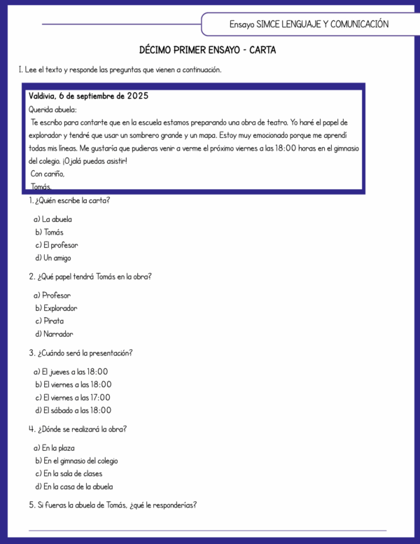 Este cuadernillo incluye 15 mini ensayos basados en el formato oficial SIMCE, con textos y preguntas que desarrollan la comprensión lectora de los estudiantes, alineados al Currículum Nacional.
