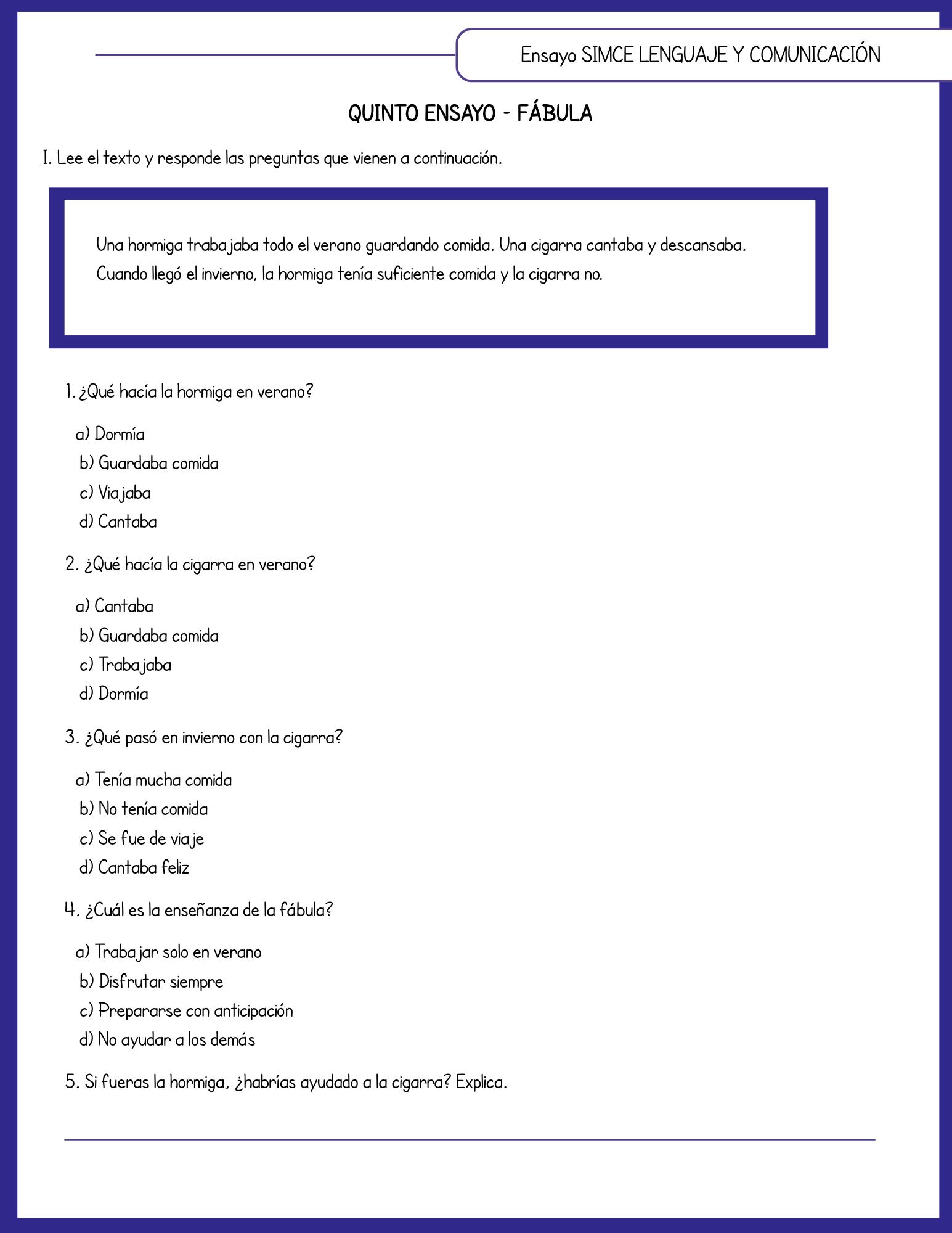 5 preguntas por ensayo (4 de alternativa + 1 abierta).