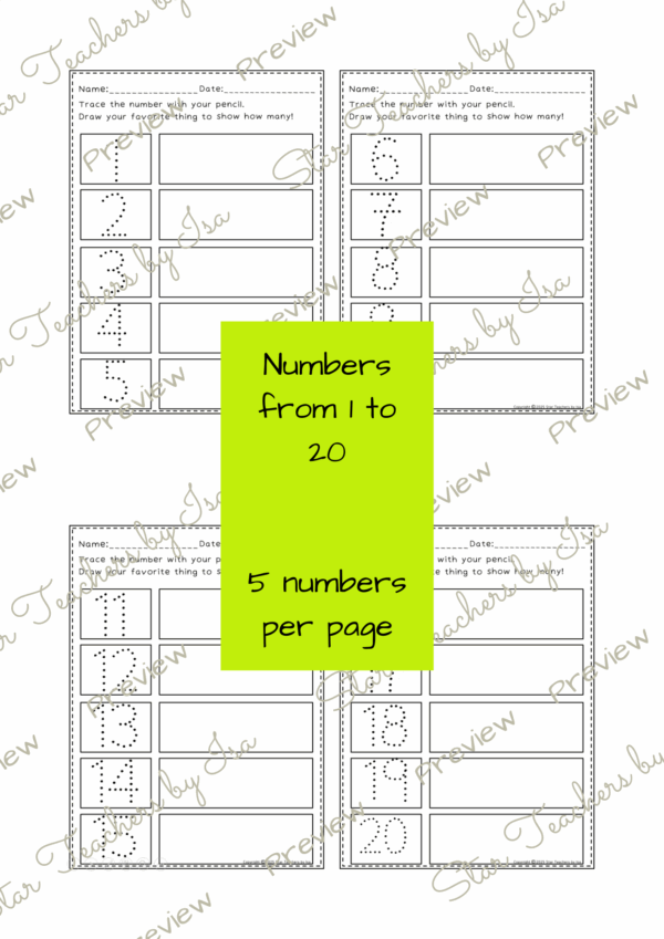 Hojas de trabajo para trazar y dibujar los números del 1 al 20.