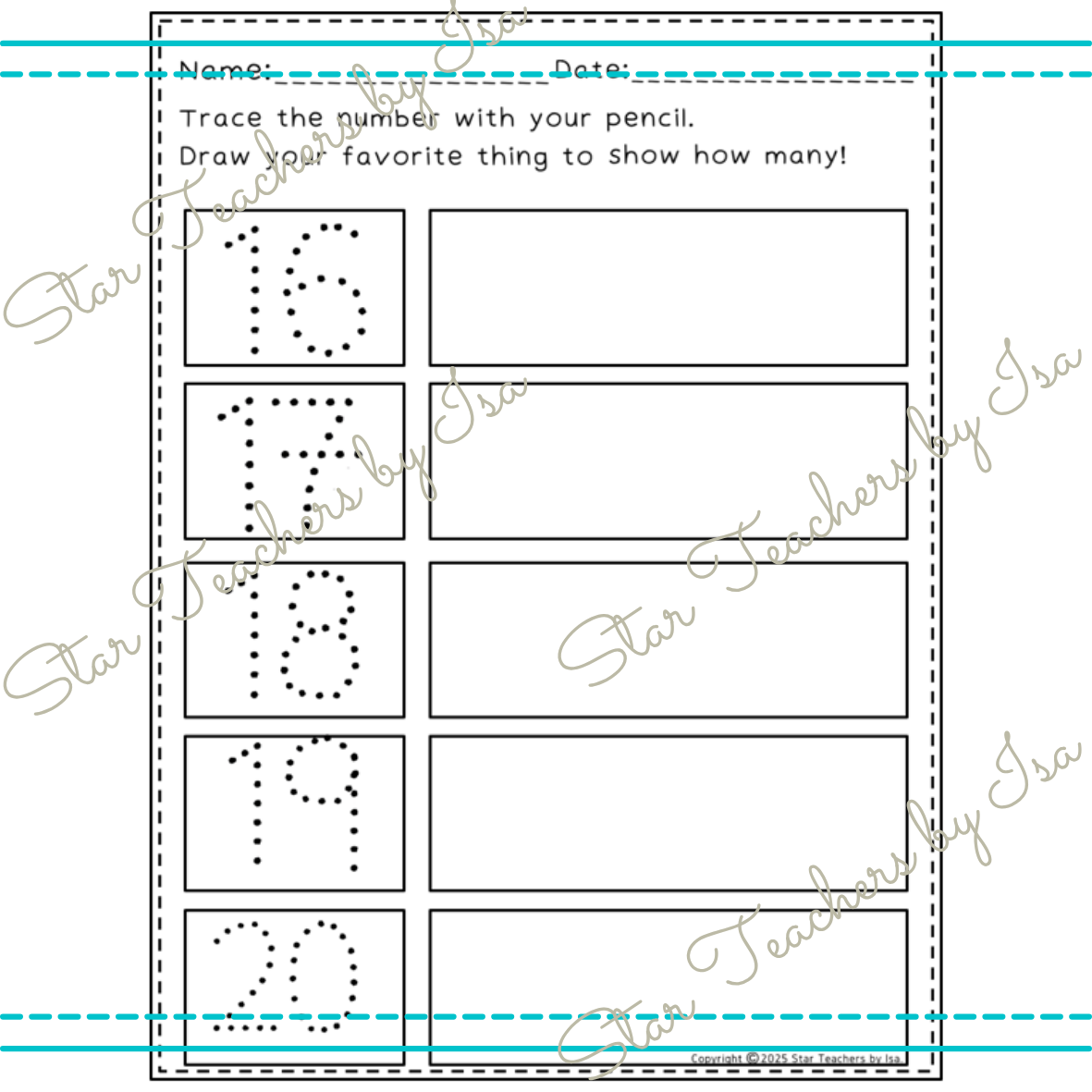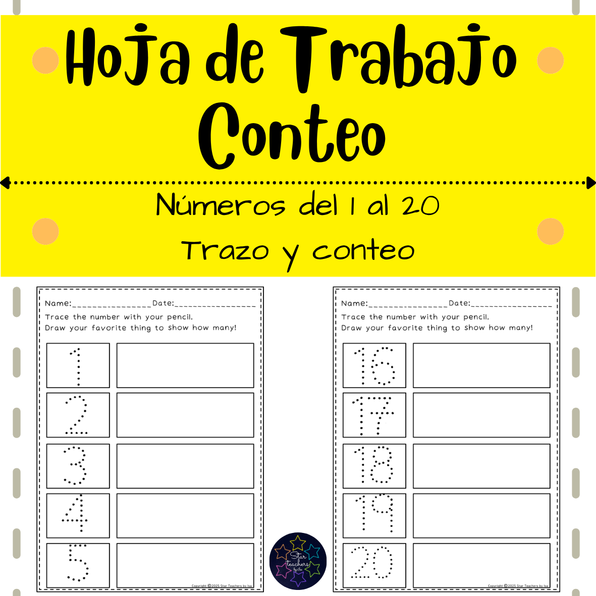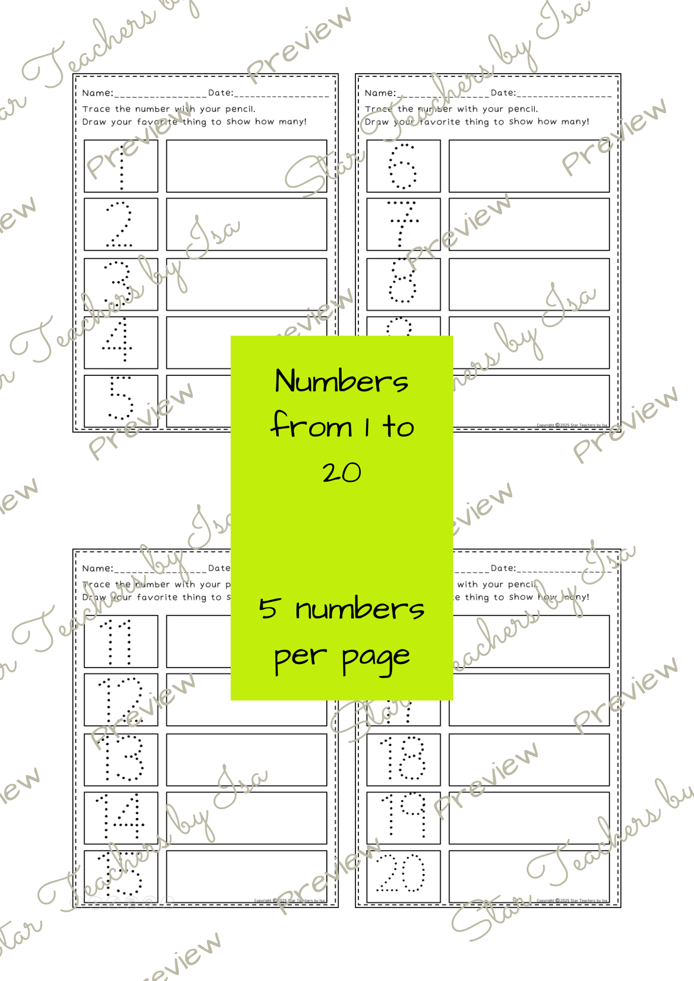 Hojas de trabajo para trazar y dibujar los números del 1 al 20.