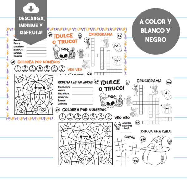 Manteles o individuales (placemats) con temática de Halloween. ¡Con 7 juegos cada uno!