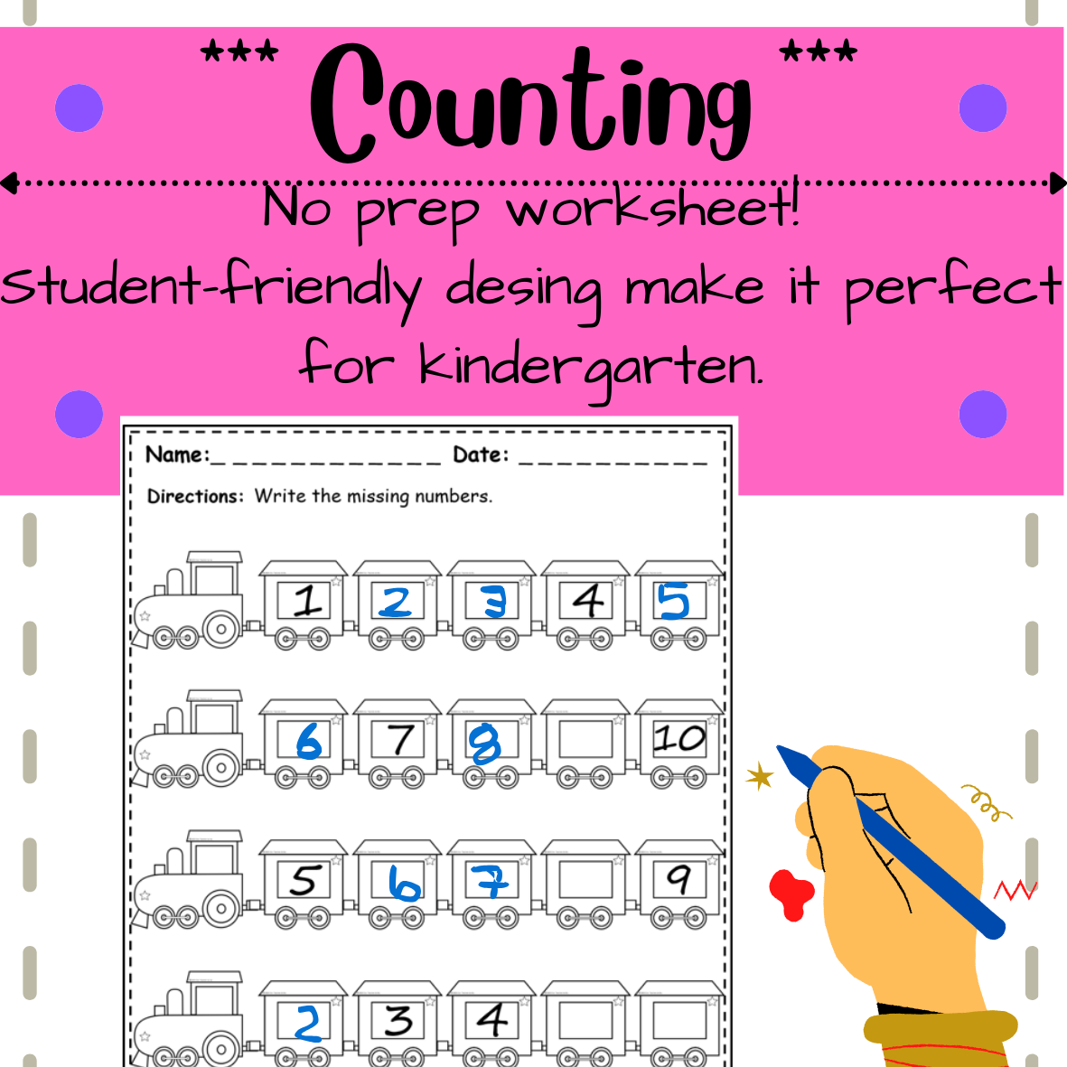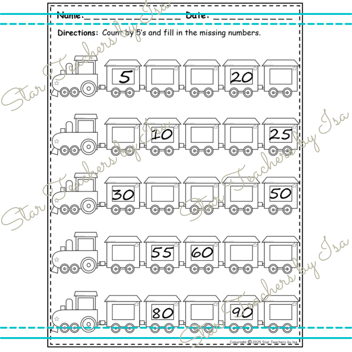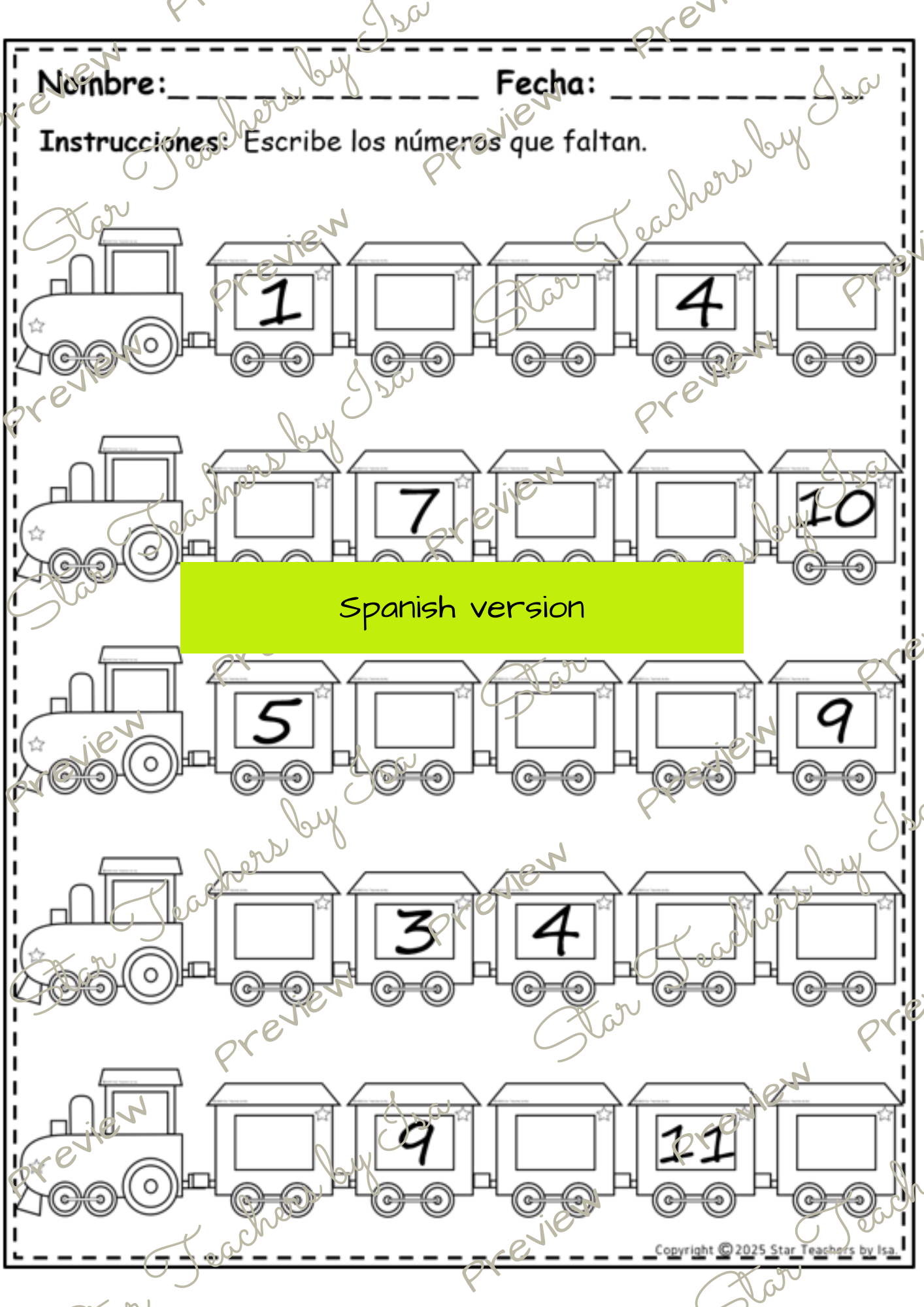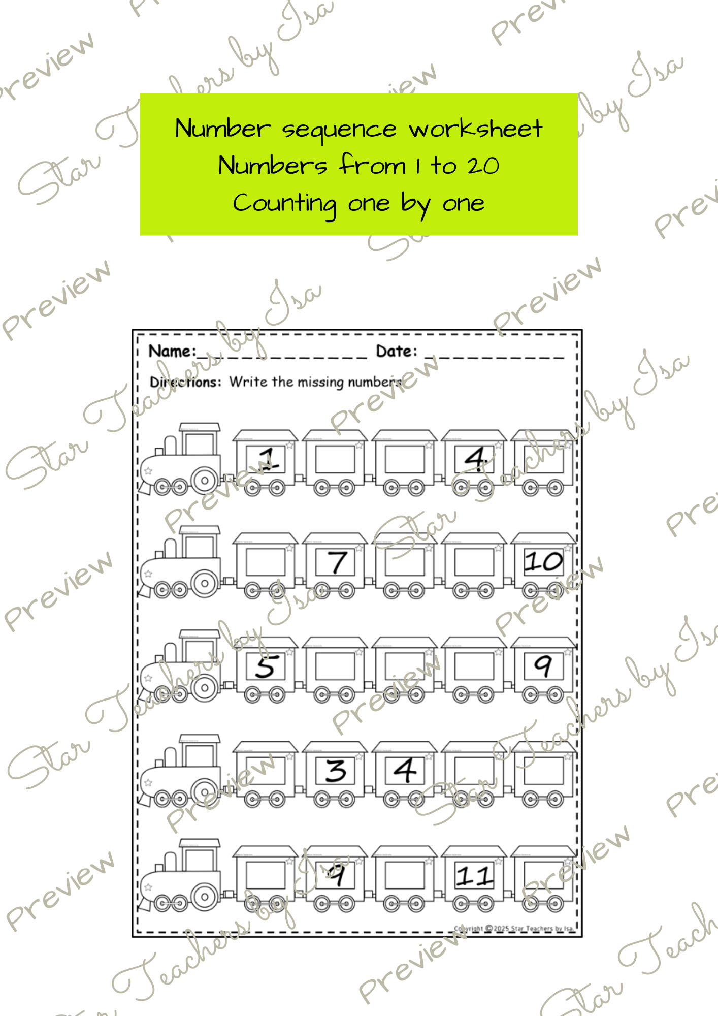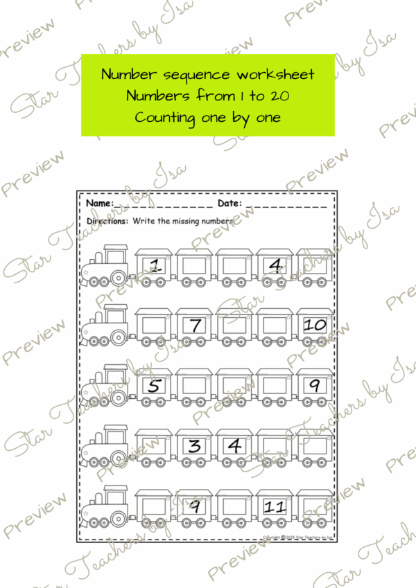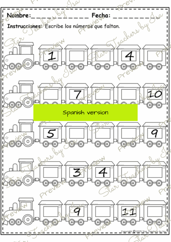 ¡Agrega un toque de diversión a tus lecciones de matemáticas—descarga hoy estas hojas de secuencia numérica con temática de trenes!