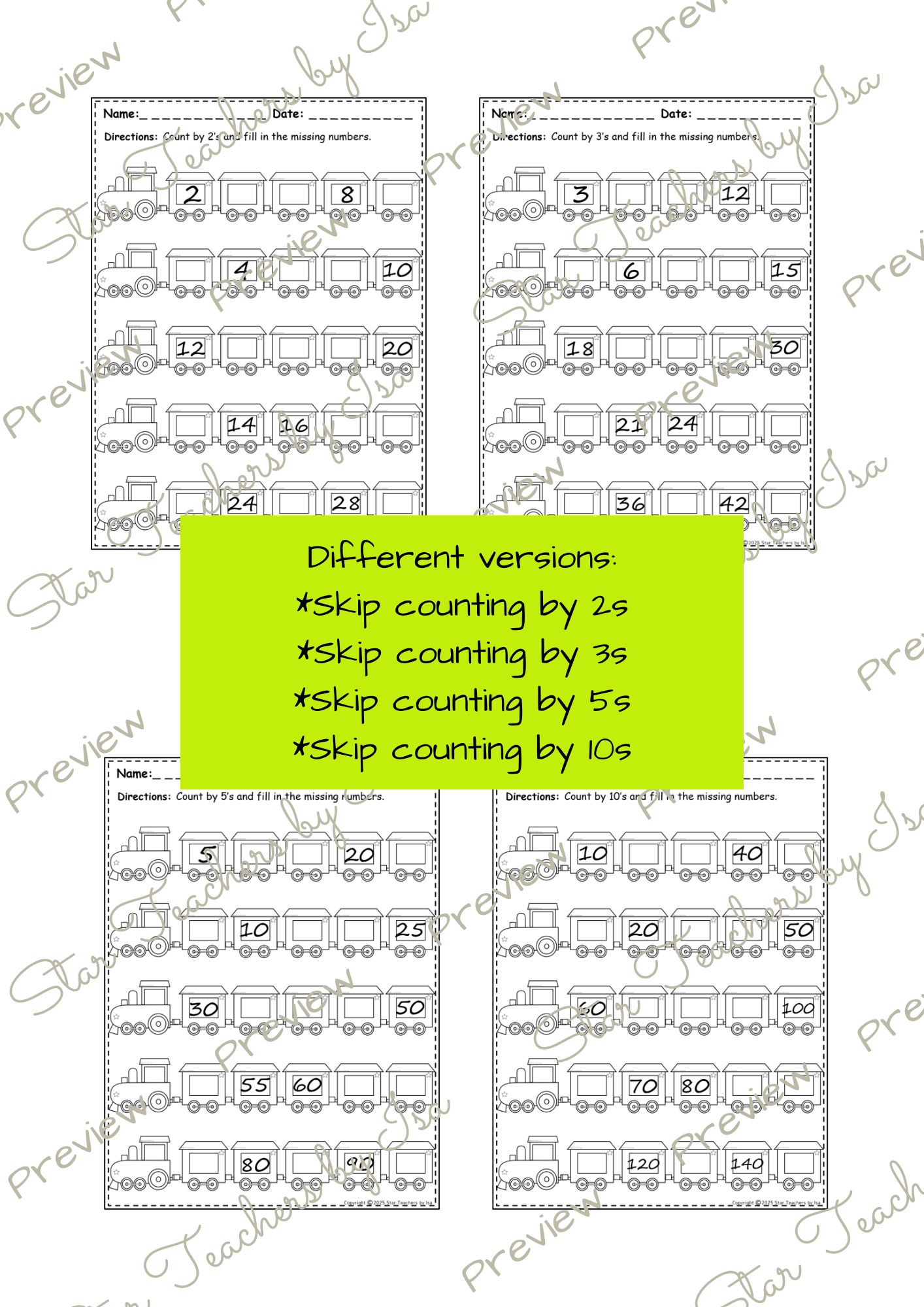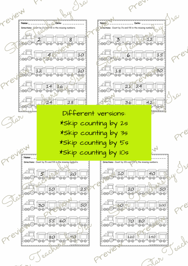 4 hojas de trabajo para conteo en saltos (de 2, 3, 5 y 10)