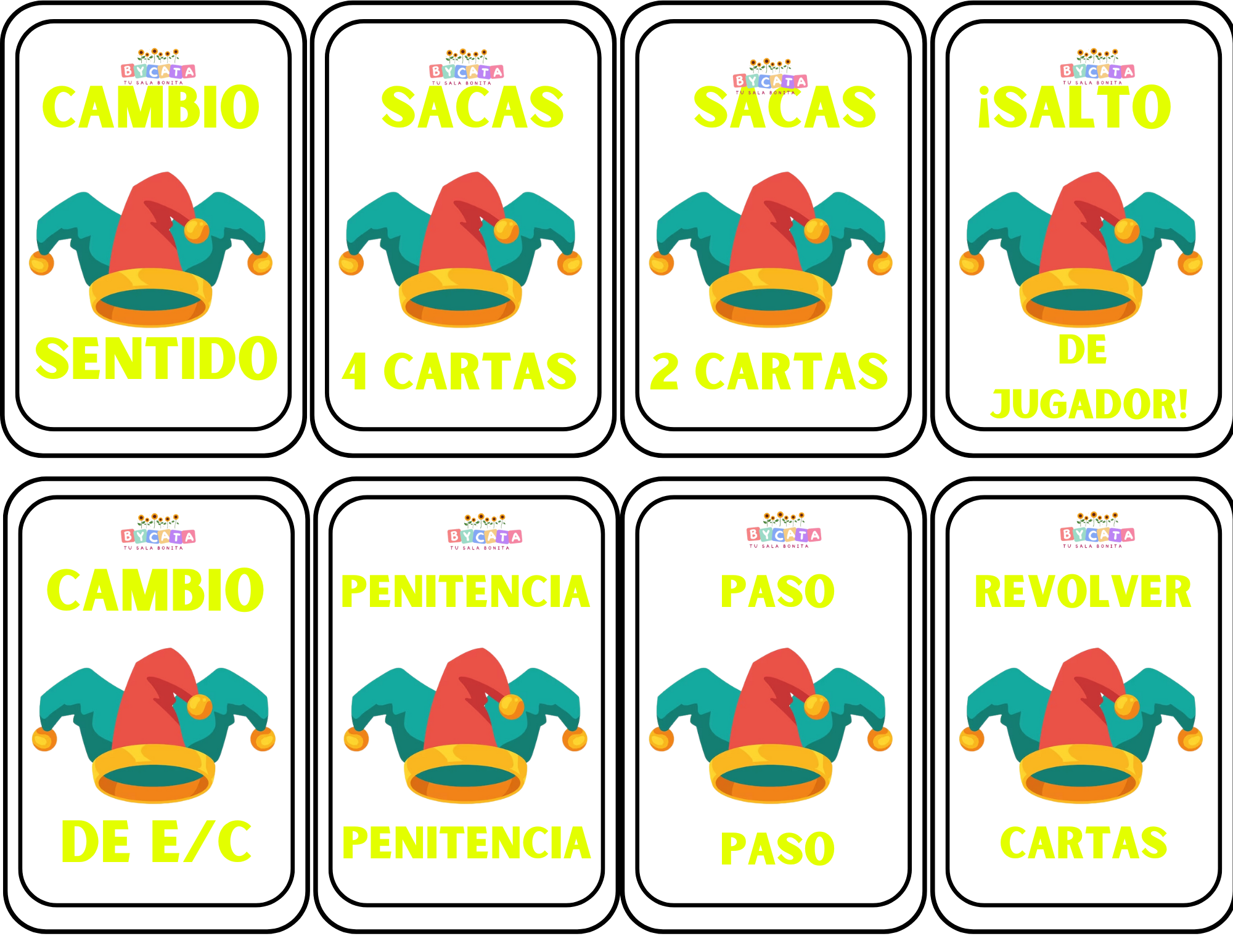 “Cambio de sentido”, “Saca 4 cartas”, “Saca dos cartas” o “Salto de Jugador”