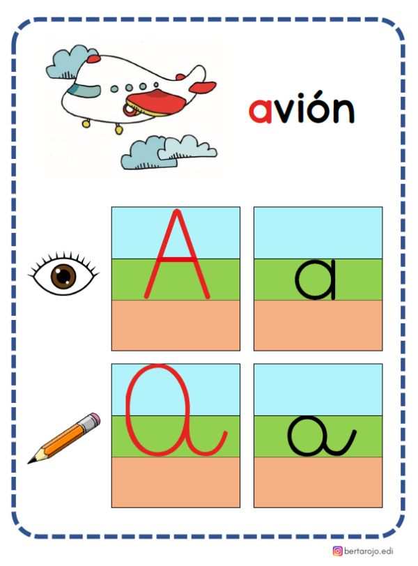 Este abecedario ayuda a comprender mejor el espacio que ocupa cada grafema, asociándolo con los colores de cielo, pasto y tierra. Incluye las cuatro formas: mayúsculas, minúsculas, imprentas y manuscritas.