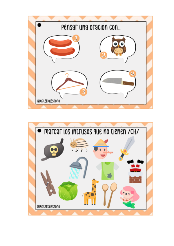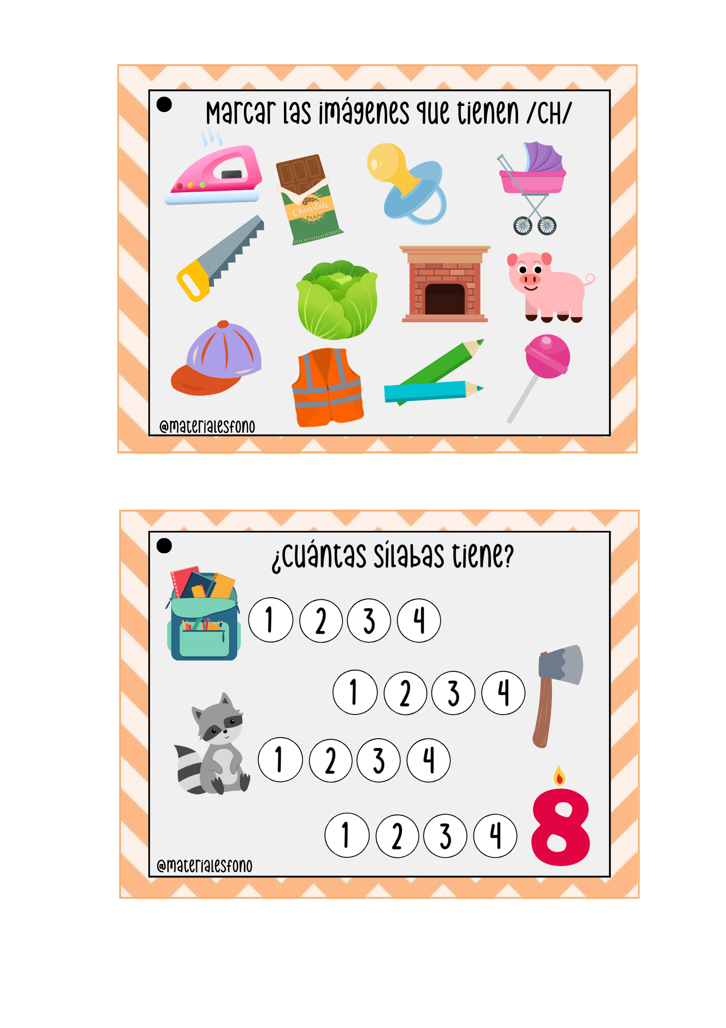 Actividad en formato de “librito” para trabajar la producción y conciencia del fonema “CH” tanto al inicio como a mitad de palabra.