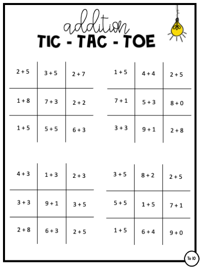 Math game in which students work on solving additions without regrouping to win the game “Tic-Tac-Toe”.