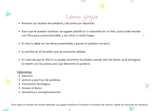 -16 tarjetas con pistas, como ayuda para encontrar la palabra.