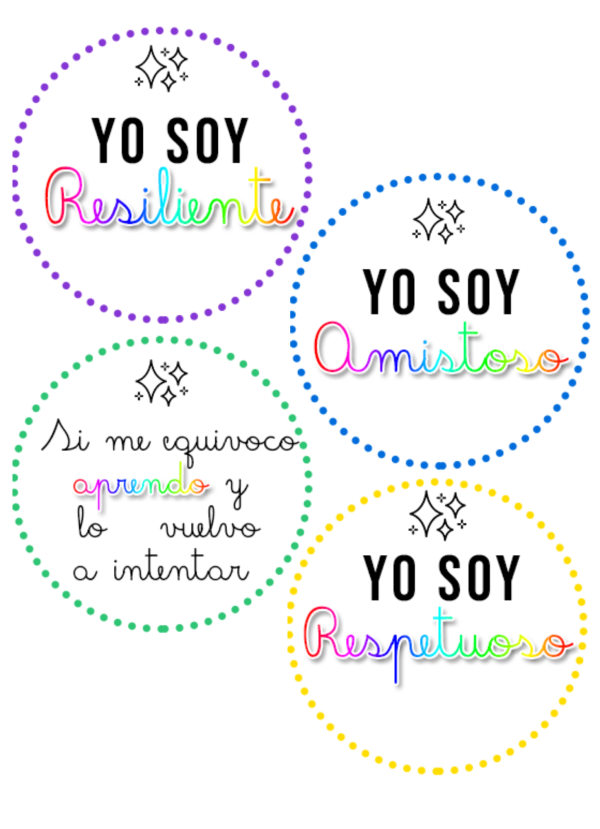 Dentro del documento hay un total de 10 afirmaciones circulares de 10×10 cms en hoja de tamaño A4 , se recomienda imprimir en papel opalina y termo laminar para mayor duración.
