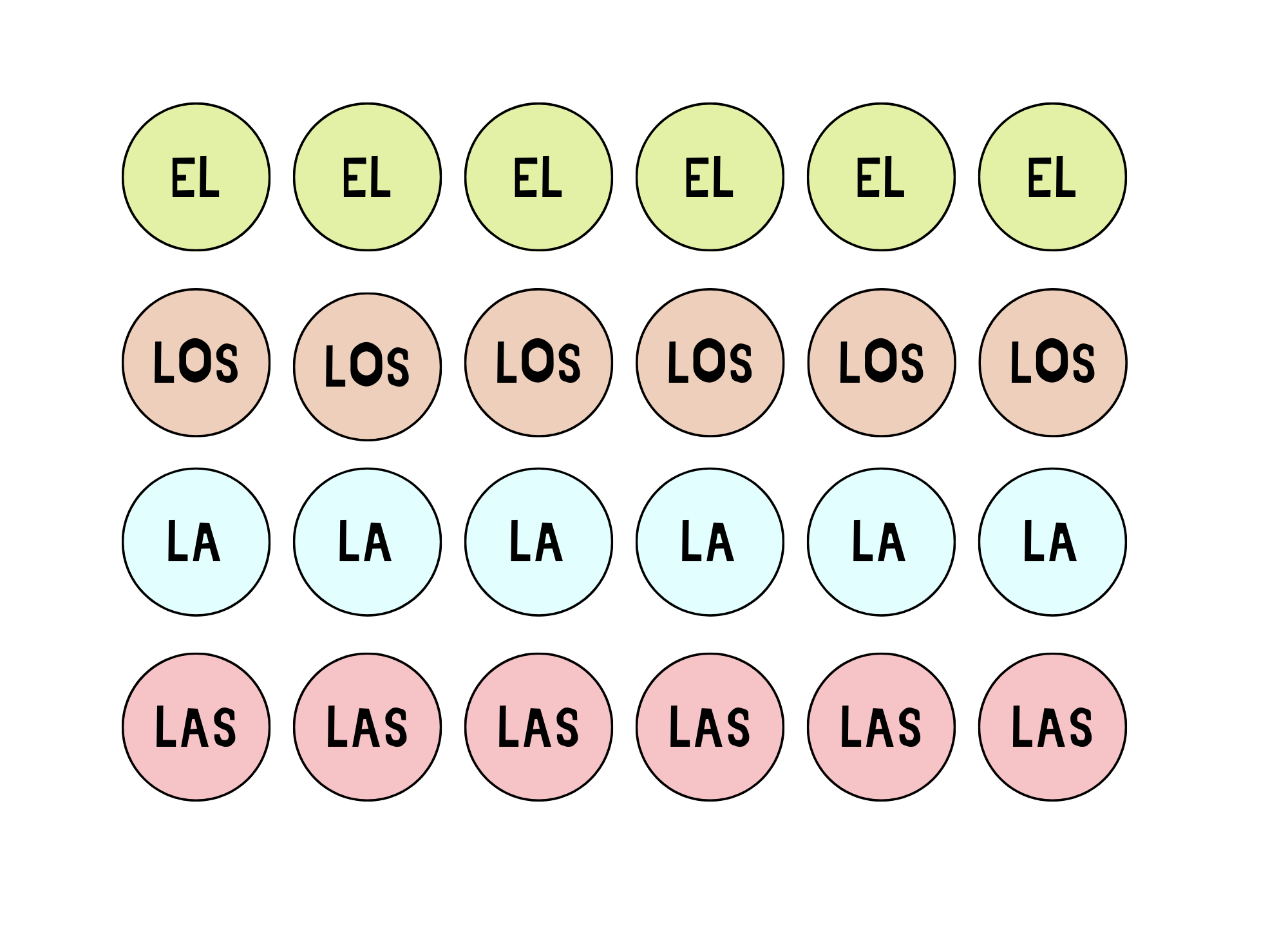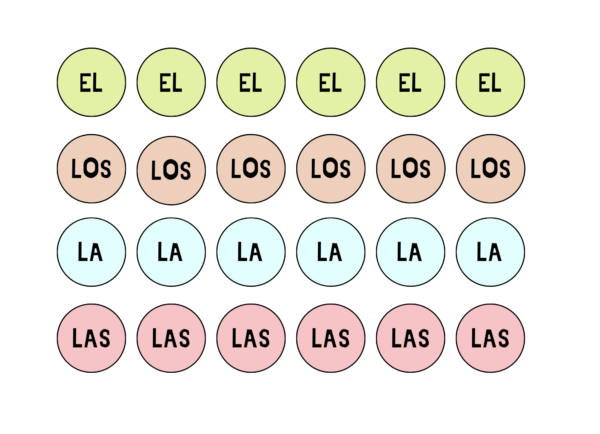 - 48 fichas con los artículos escritos (24 con articulos definidos y 24 con indefinidos)