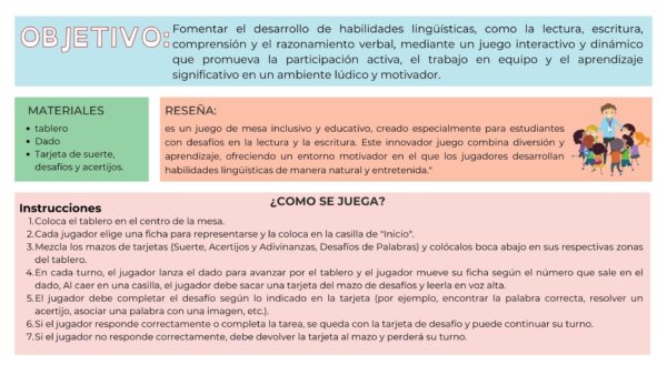 es un juego de mesa inclusivo y educativo, especialmente diseñado para estudiantes que enfrentan desafíos en la lectura y la escritura. Este innovador juego combina el aprendizaje lingüístico con la diversión, promoviendo el desarrollo de habilidades clave como la comprensión lectora, el razonamiento verbal y la escritura creativa.