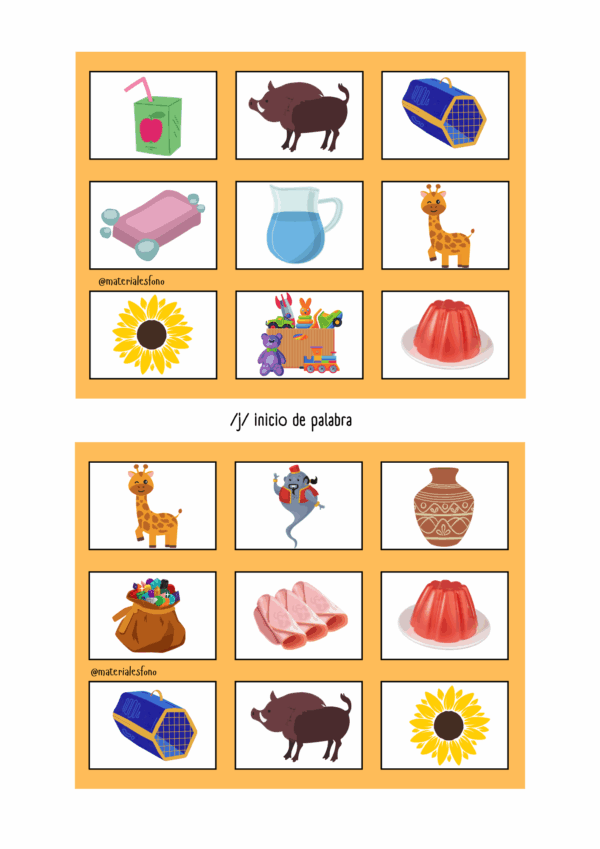 - 2 tableros de bingo con imágenes con /j/ tanto al inicio como intermedia (para trabajar ambas ubicaciones en simultáneo)