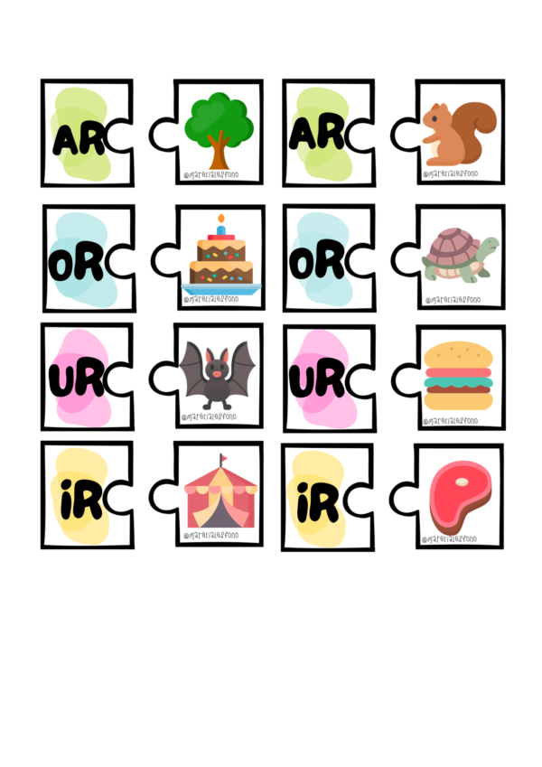 16 pares de puzzles para asociar la imagen con la sílaba correcta: AR-ER-IR-OR-UR