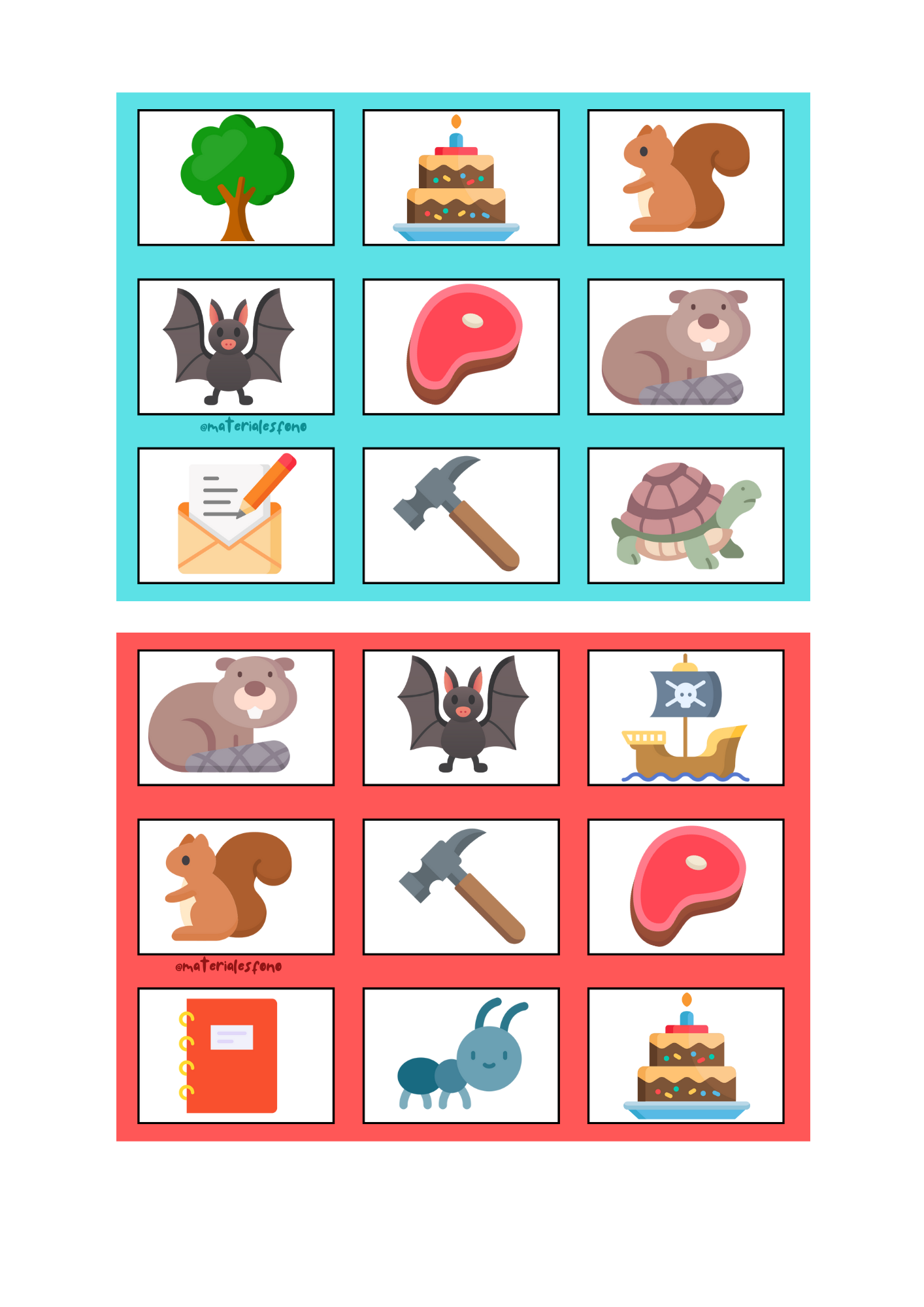 Contiene: 4 cartones de bingo con 9 imágenes cada uno, y 16 fichas con las imágenes correspondientes (con el fonema R en posición VC).