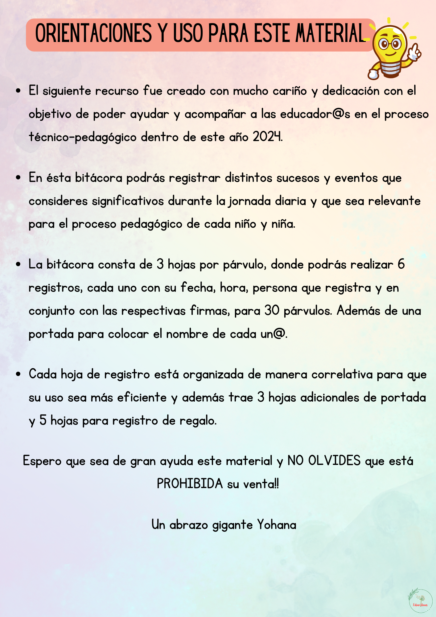 📒La bitácora consta de 3 hojas por párvulo, donde podrás realizar 6 registros, cada uno con su fecha, hora, persona que registra y en conjunto con las respectivas firmas. En un formato para 20 o 30 párvulos. Además de una portada para colocar el nombre de cada un@.