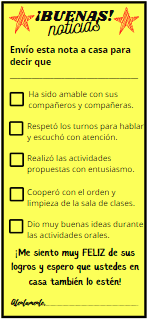 ¡Sólo debes escribir el nombre del niño o niña que deseas destacar, chequear el o los cuadros que se relacionen con la actitud que quieres comunicar a casa y firmarlo!