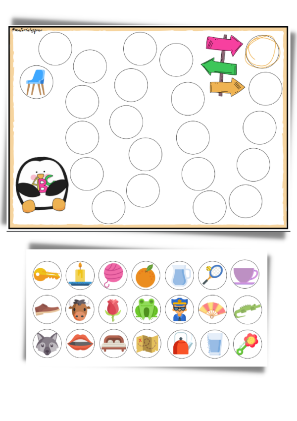 La actividad consiste en formar un camino, colocando palabras (imágenes) que comiencen con el último sonido de la anterior. Sirve para trabajar conciencia fonológica de primer y último fonema, atención, lectura, escritura.