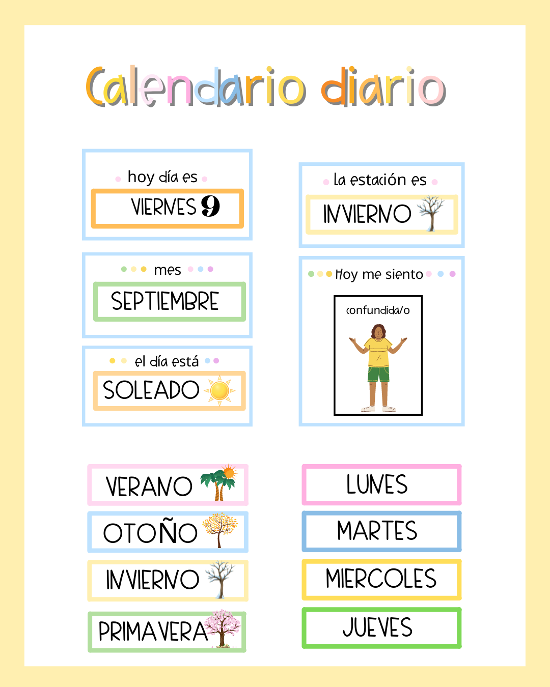 Material descargable, calendario diario para anticipar y también para trabajar responsabilidades dentro del aula, también puede ser utilizado en casa.