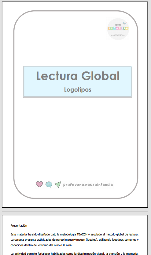 Este material ha sido diseñado bajo la metodología TEACCH y asociado al método global de lectura. La carpeta presenta actividades de pareo imagen–imagen (iguales), utilizando logotipos comunes y conocidos dentro del entorno del niño o la niña.
