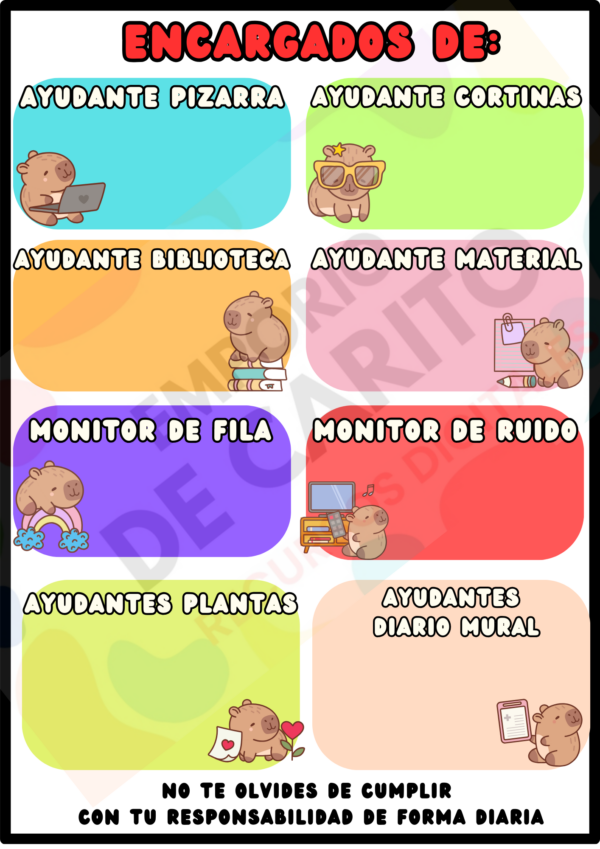 Si quieres un aula organizada y que tus estudiantes disfruten de los beneficios esta es una buena estrategia. Utiliza este material para escribir de forma semanal a los encargados de alguna tarea en particular, plastificando y escribiendo en el los nombres de tus estudiantes.