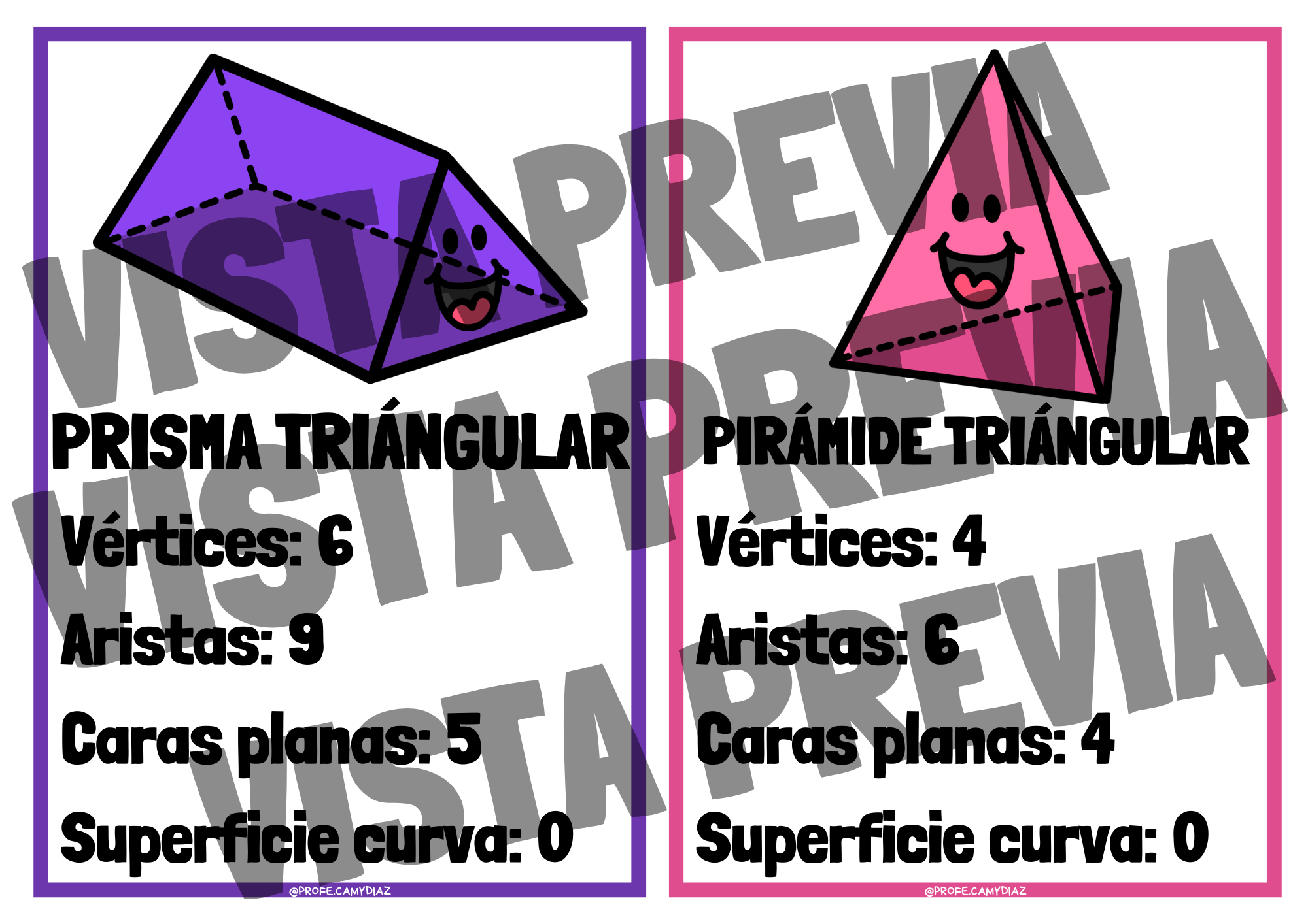 - Figuras 3D con cara y a color como: cubo, paralelepípedo, pirámide, esfera, cilindro, cono, prisma triangular y pirámide triangular.