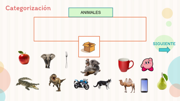 Estudiantes deben seleccionar el elemento que es parte de la categoría indicada. Al tocar elementos que son parte de la categoría, el dibujo se mueve dentro de la caja, los que no son parte de la caja se negaran a moverse.