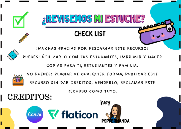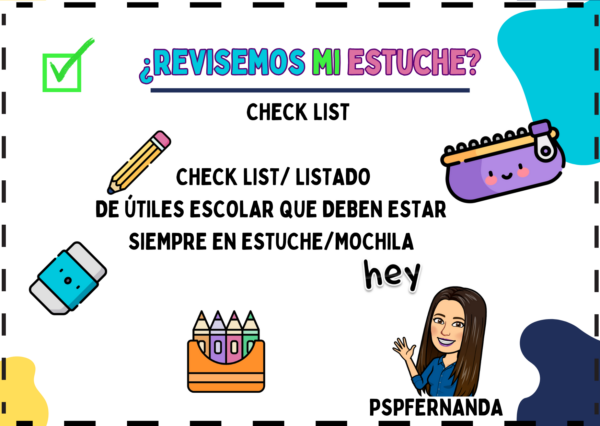 check list, lista, recurso imprimible para dar a estudiantes o familias y así ayudar a mantener útiles escolares que se deben llevar en el estuche/mochila a sala de clases.