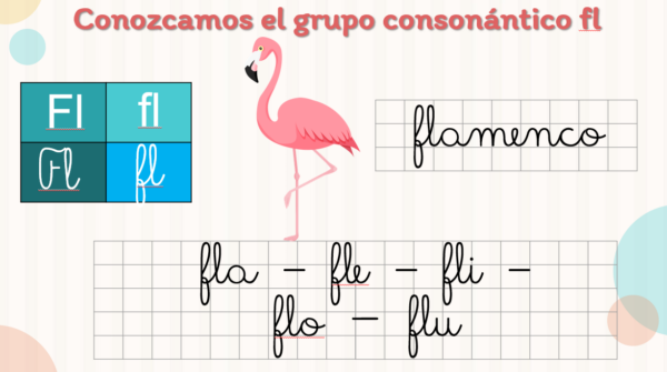 – Diapositiva de presentación del grupo consonántico con su escritura en ligada e imprenta + imágen representativa y sílabas fra-fre-fri-fro-fru / fla-fle-fli-flo-flu en ligada.