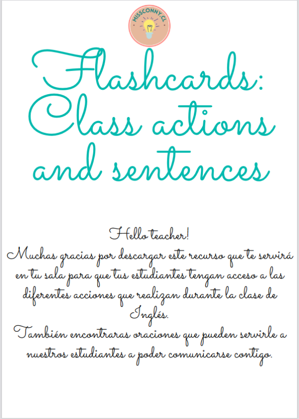 En este recurso puedes encontrar un set de 10 flashcards con distintas acciones que realizamos en nuestra clase de Inglés con su respectivo apoyo visual.