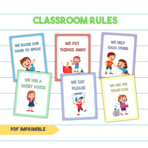 14 pósters (a color) en inglés con las reglas de la clase o Classroom Rules.