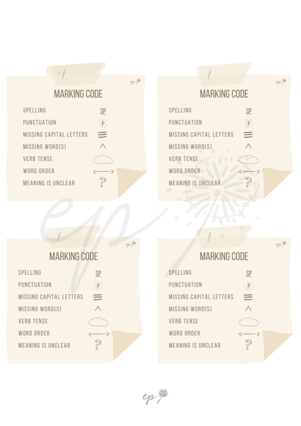 El código de corrección se refiere a un sistema de símbolos y abreviaturas que se utilizan para señalar y corregir errores específicos en los trabajos escritos de los estudiantes. En lugar de corregir directamente en el texto, se marcan los errores con símbolos o códigos. Esta estrategia promueve la retroalimentación rápida y enfocada, al tiempo que fomenta la autonomía y el desarrollo de habilidades de edición en los estudiantes. ¡Encuéntralo en español y en inglés!