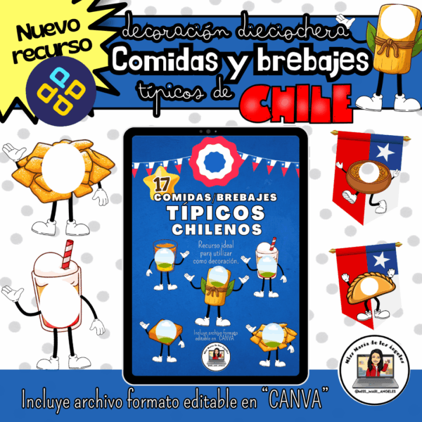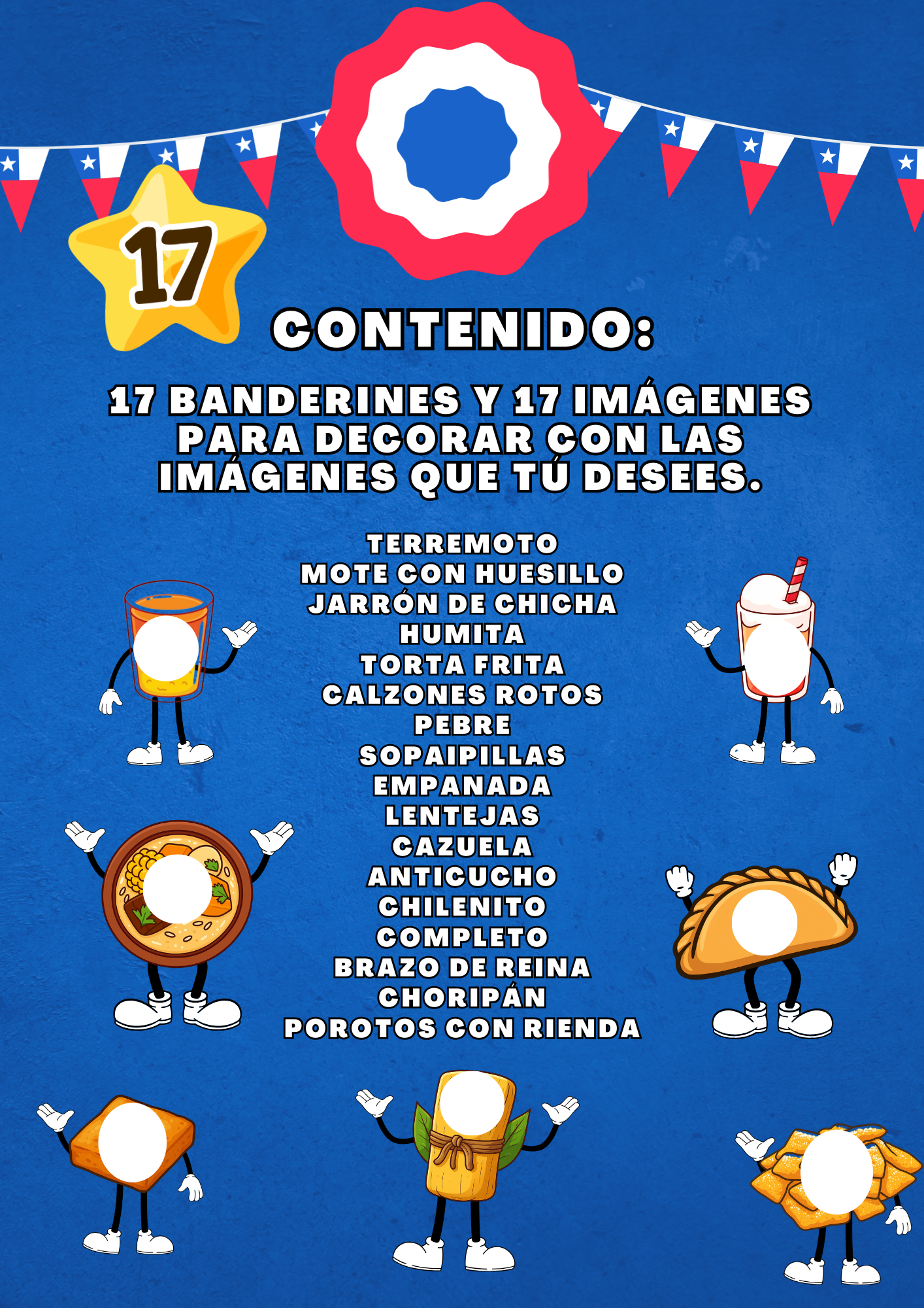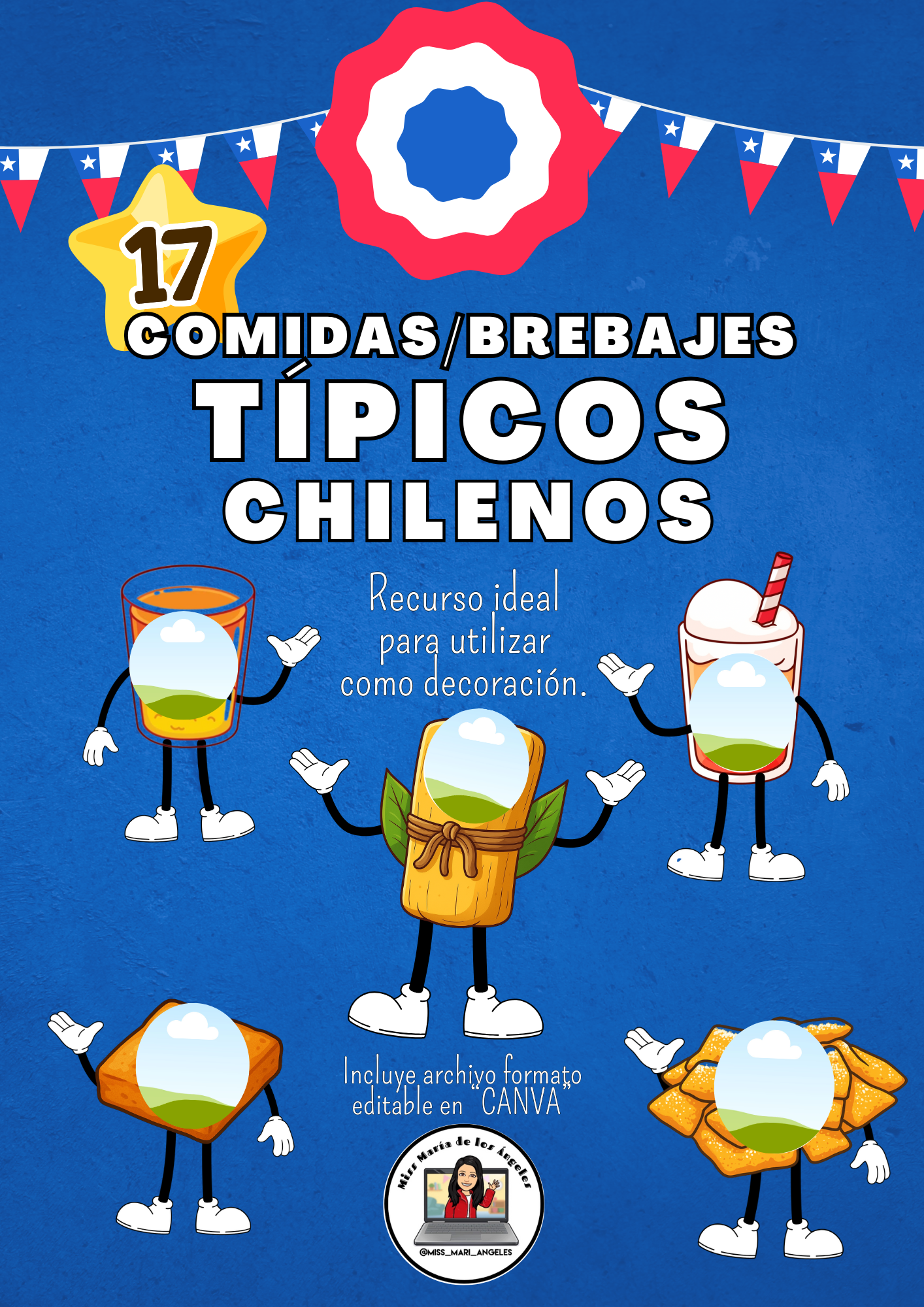 👍 En este recurso encontrarás 17 banderines y 17 imágenes con comidas y brebajes tradicionales de Chile, ideales para decorar tu sala o utilizar en actividades culturales con tus estudiantes.