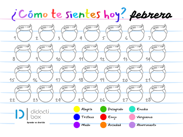 Te presentamos un novedoso calendario de emociones donde tus alumnos podrán colorear las caritas de los niños, de acuerdo con el código de color. Aquí el mes de febrero, los demás meses también están disponibles para ti de manera gratuita.