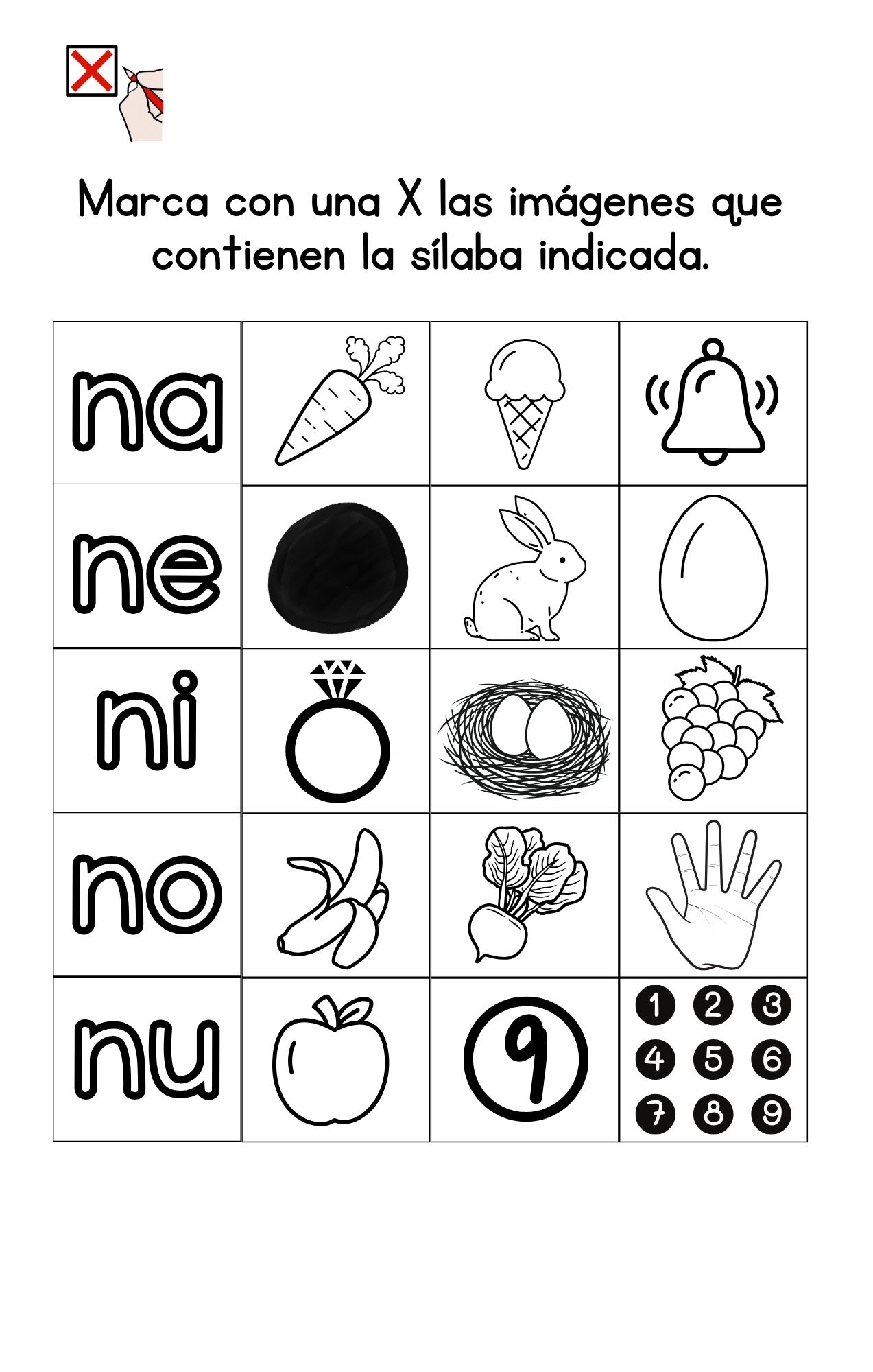 - Identifica las sílabas: Los estudiantes deberán marcar con una X las imágenes que contienen la sílaba indicada.