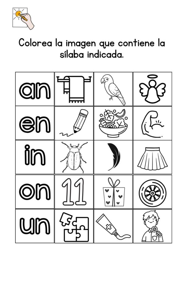 - Colorea las imágenes: Según la sílaba solicitada, los niños identificarán y colorearán la imagen correspondiente.