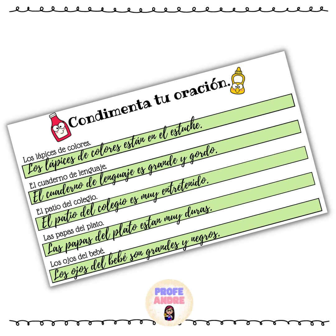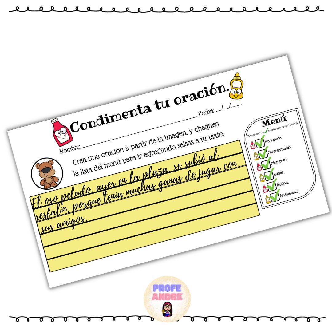 - 1 poster de apoyo para el aula, con check list para identificar los elementos agregados en cada oración.