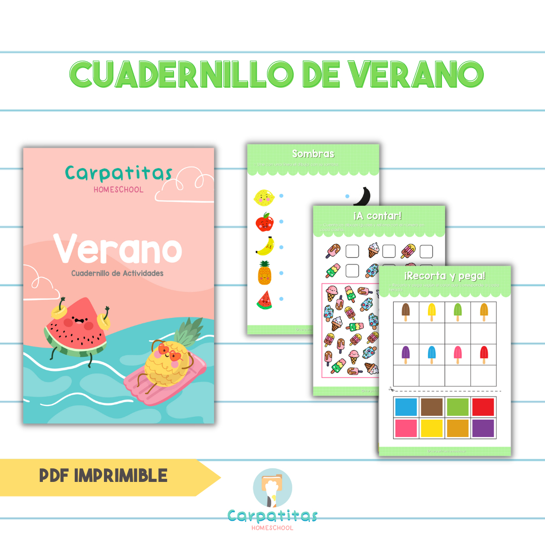 Incluye: Encerrar los dibujos de verano, trazar diversas líneas, trazar palabra Verano + colorear dibujo, pintar con dedos, clasificar por colores, completar las letras que faltan, unir el dibujo con su sombra, conectar los puntos, 5 diferencias, ¿Cuál es diferente?, encontrar la sombra correcta, ordenar por tamaño, recortar y pegar para completar el patrón y más!
