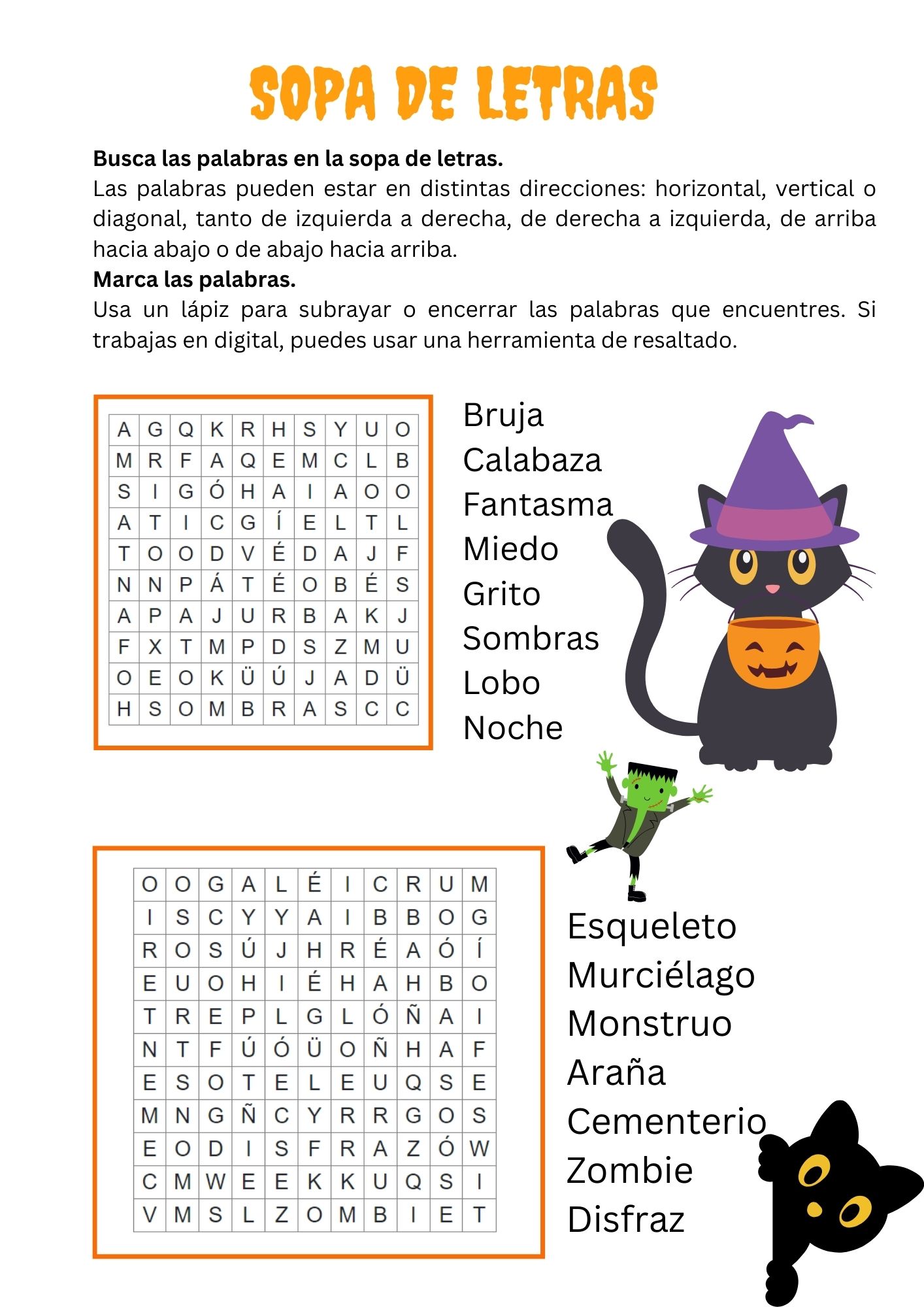 Sopas de Letras: Desafiantes sopas de letras con palabras relacionadas con Halloween, perfectas para reforzar el vocabulario de manera entretenida.