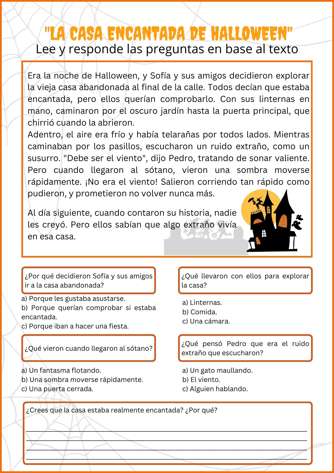Comprensión de Texto: Lecturas cortas relacionadas con Halloween seguidas de preguntas que fomentan la comprensión lectora.
