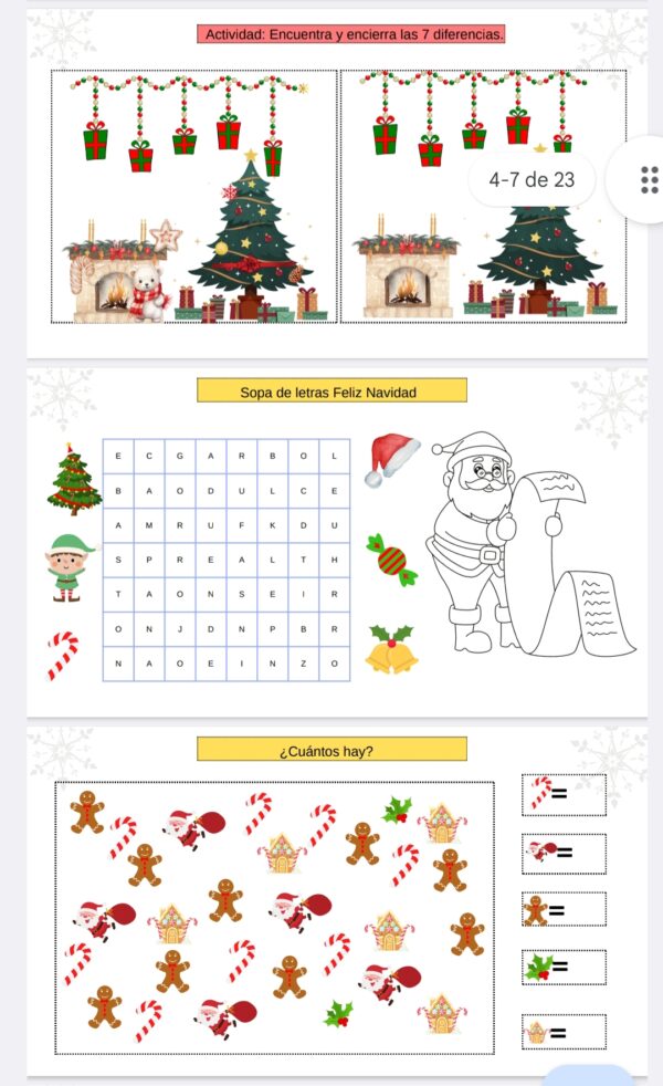 En esta oportunidad comparto cuadernillo de 22 páginas con diversas actividades navideñas tales como laberintos, conteo, diferencias, colorear, números, entre otros, todos con temática navideña.