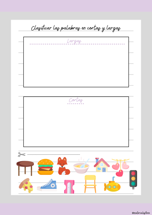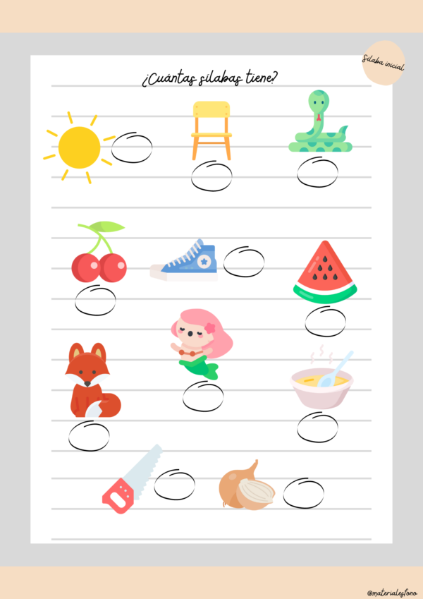 Actividad para trabajar la conciencia y producción del fonema /s/ (letras S, C, Z) en posición directa en la sílaba (CV), en palabras de 1, 2, 3 y 4 sílabas.