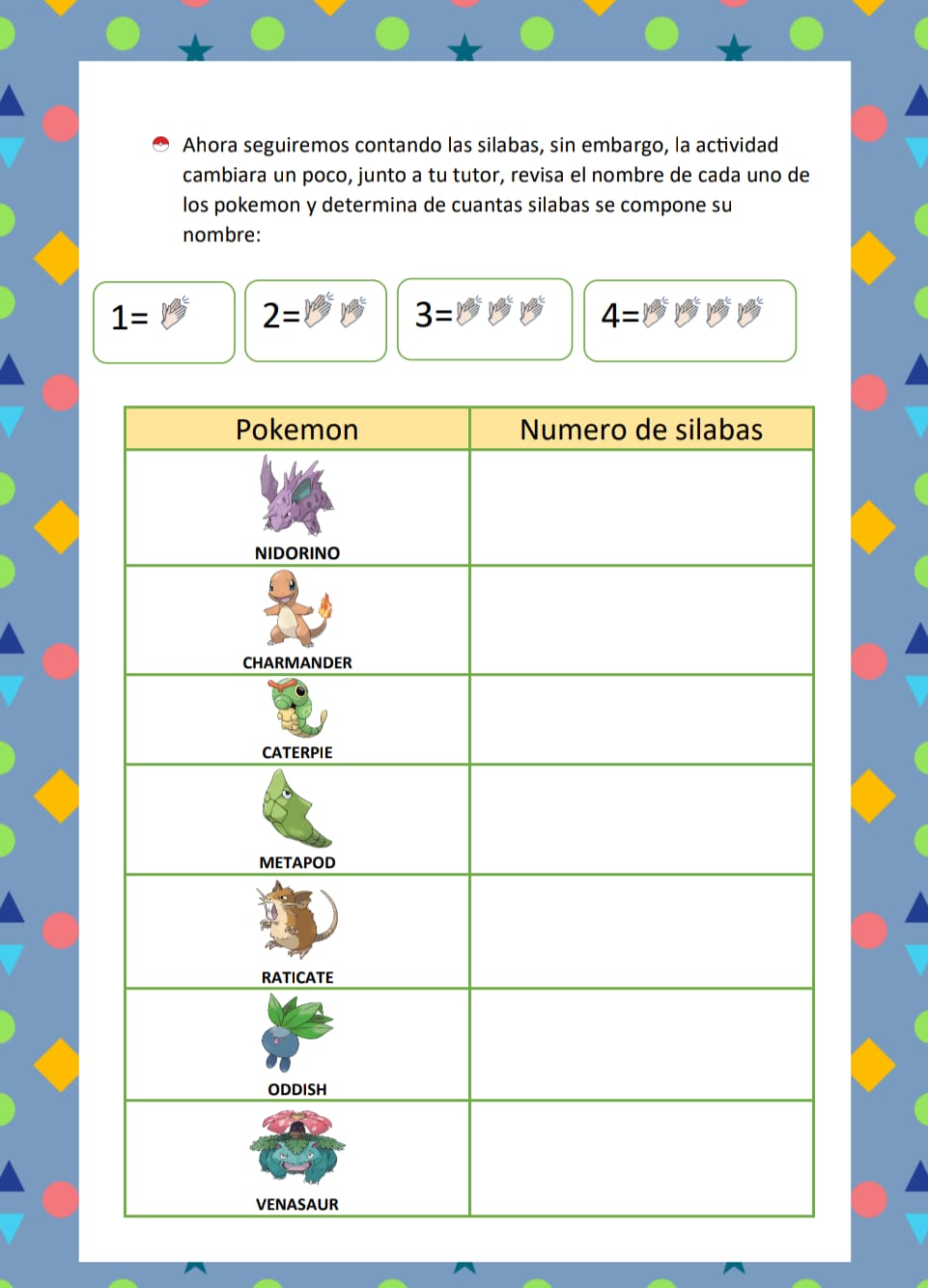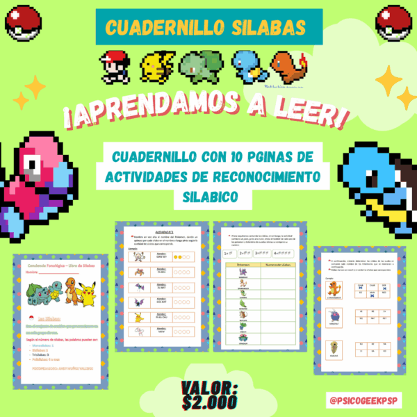 Cuadernillo con temática Pokémon en formato PDF, contiene 10 paginas de reconocimiento silábico.