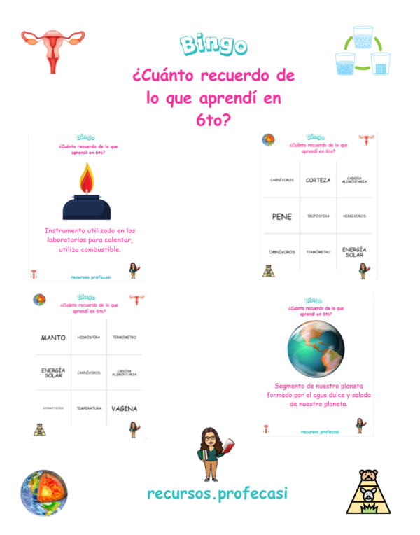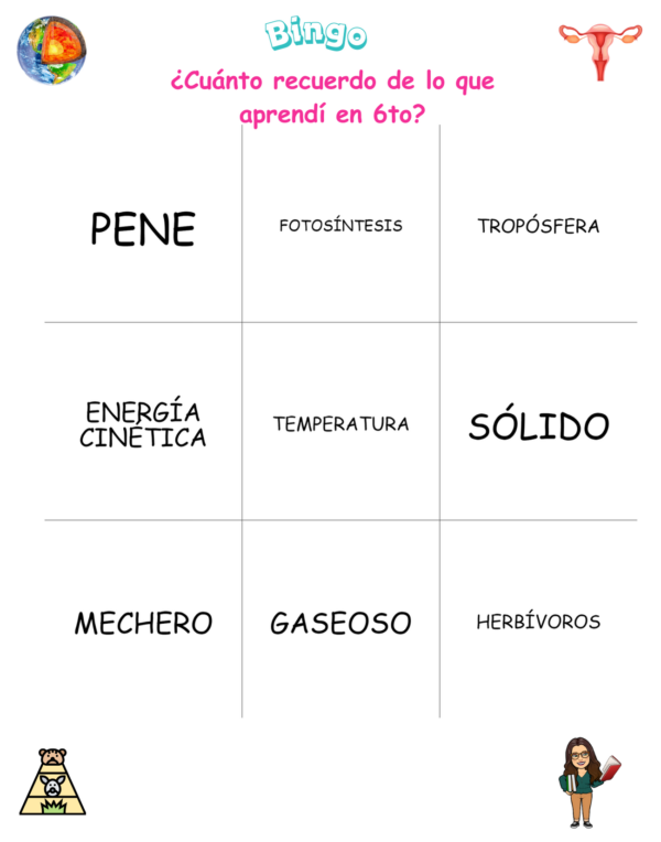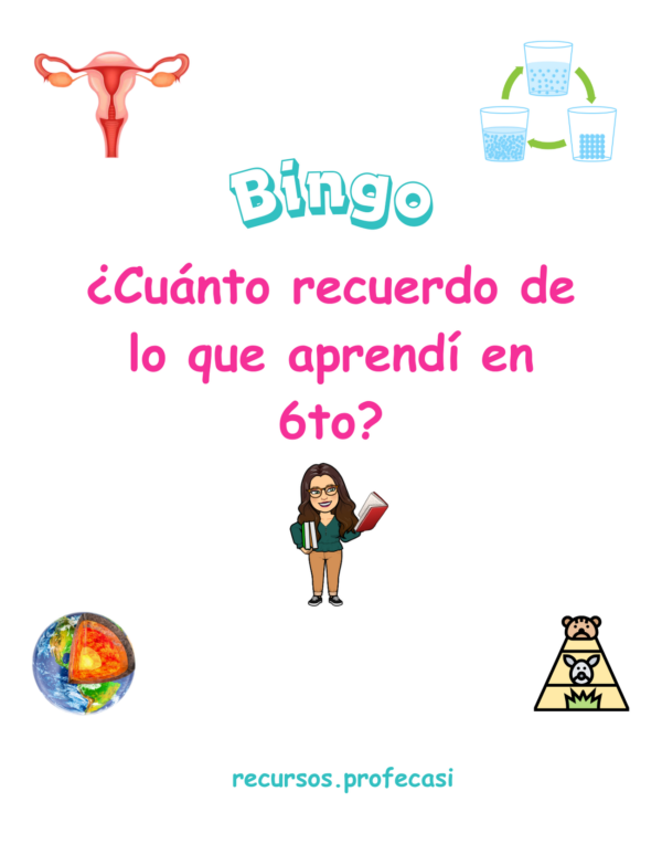 El Bingo de Ciencias Naturales es un recurso educativo diseñado para reforzar, de manera lúdica y significativa, los principales conceptos trabajados durante el año escolar. Este juego permite que los estudiantes repasen contenidos clave mientras participan en una dinámica colaborativa, entretenida y altamente motivadora.