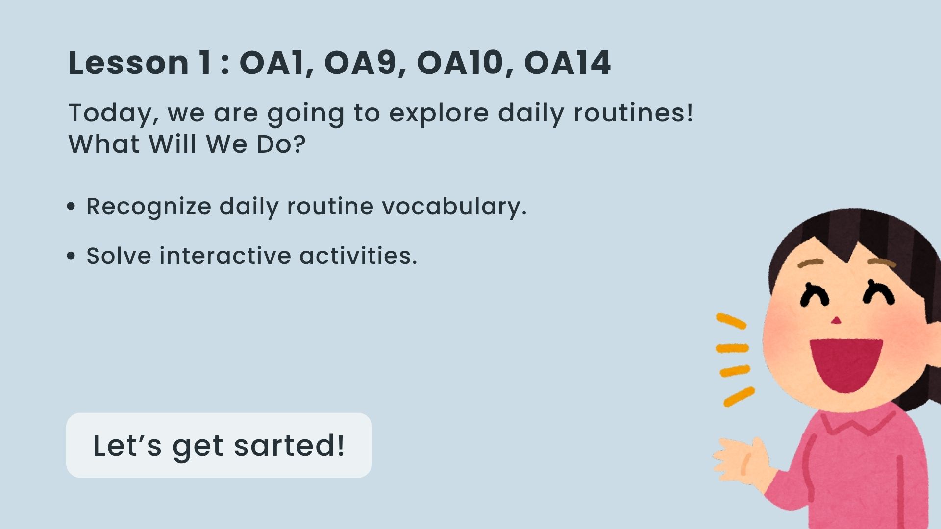 Este recurso fue diseñado para estudiantes de enseñanza básica con un nivel inicial de inglés. Está enfocado en enseñar daily routines de forma entretenida, interactiva y significativa. Perfecto para trabajar los OA 01, 09, 10 y 14 del currículum chileno 🇨🇱📘.