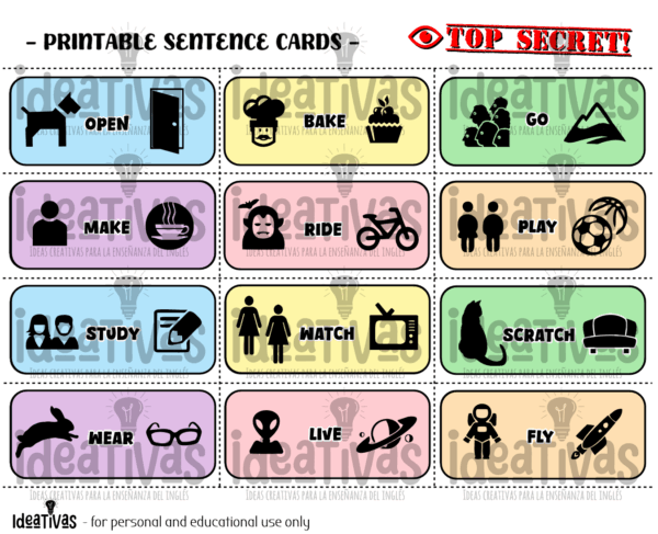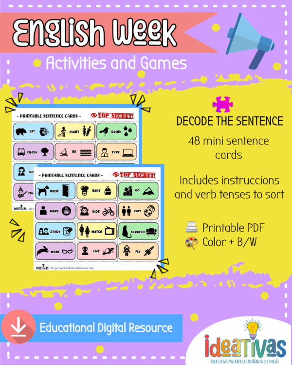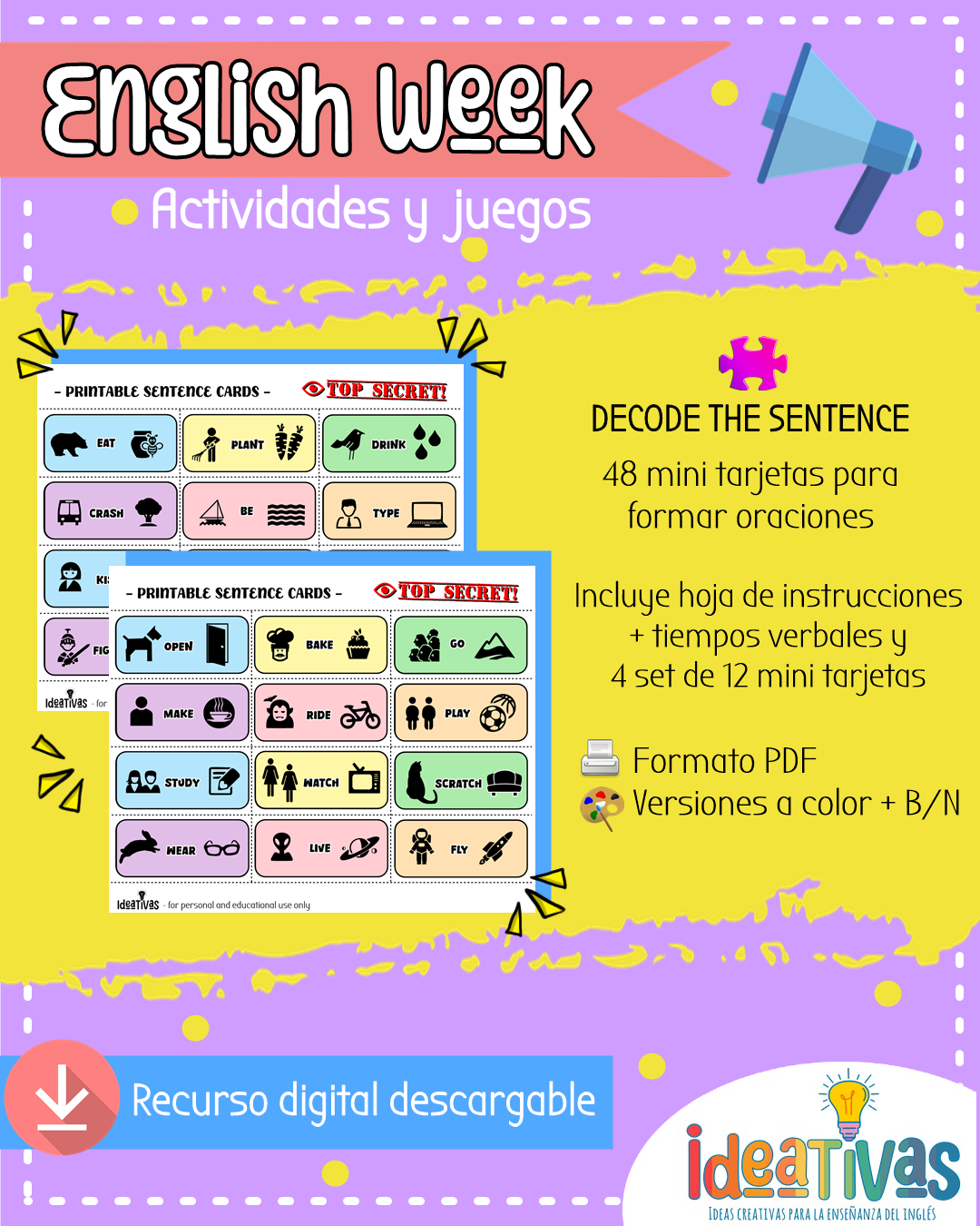 Una forma creativa y visual de practicar la estructura de oraciones en inglés. Este juego incluye 48 mini tarjetas donde los estudiantes deben “descifrar” cada oración de acuerdo a los íconos y verbos entregados.