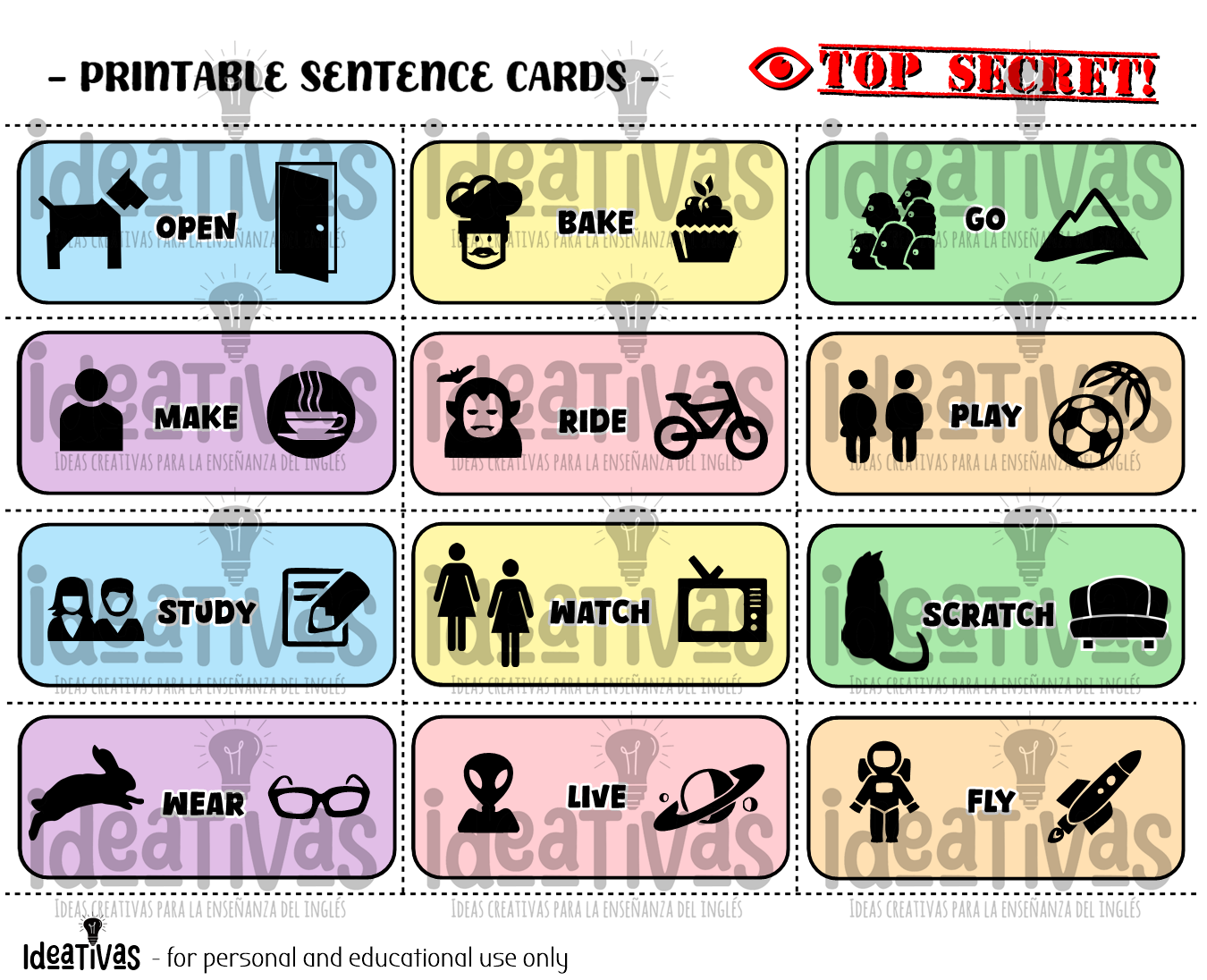 A creative and visual way to practice English sentence structure. This game includes 48 mini cards where students “decode” each sentence according to the icons and verbs given.