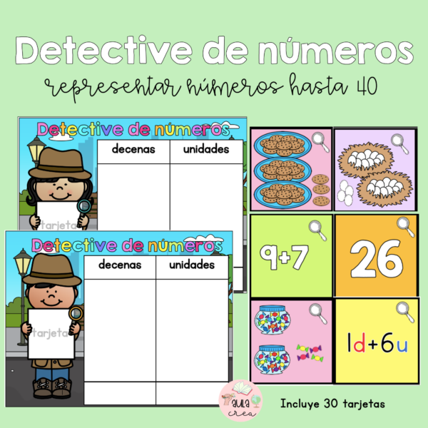 Incluye 4 modelos del tablero de unidades y decenas y 30 tarjetas con números representados de distintas formas: a través de dibujos (pictórico), composición aditiva y número escrito.
